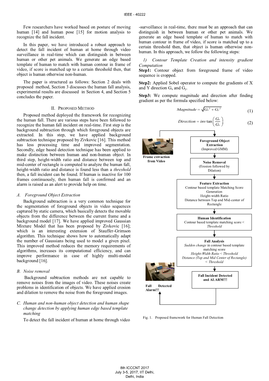 提出的方法部署了用于识别人类跌倒的框架。采取如下各种步骤来实时识别人类跌倒事件。第一步是背景消除法,通过背景消除法提取前景对象。在这一步中,我们应用了Zivkovic [16]提出的背景消除技术。 该方法处理时间更少,分割效果更好。第二步,基于边缘的检测技术用于区分人类和非人类物体。第三步,计算出矩形的宽比和顶部到矩形中点的距离,以分析人的跌倒,发现宽高比和距离小于阈值,即发现跌倒事件。如果人连续100帧不活动,则确认有人跌倒,并发出警报作为警报,以提供及时的帮助。