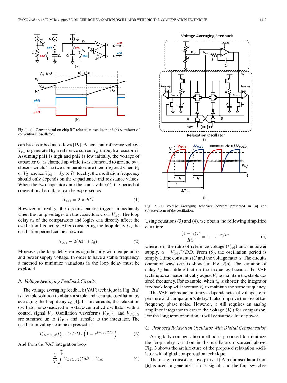 图2(a)中的平均电压反馈(VAF)技术是通过平均环路延迟td [4]来获得稳定而准确的振荡的可行解决方案。在该电路中,张弛振荡器被认为是具有控制信号Vc的压控振荡器。振荡波形VOSC1和VOSC2总计为VOSC,并传输到积分器。振荡电压可以表示为