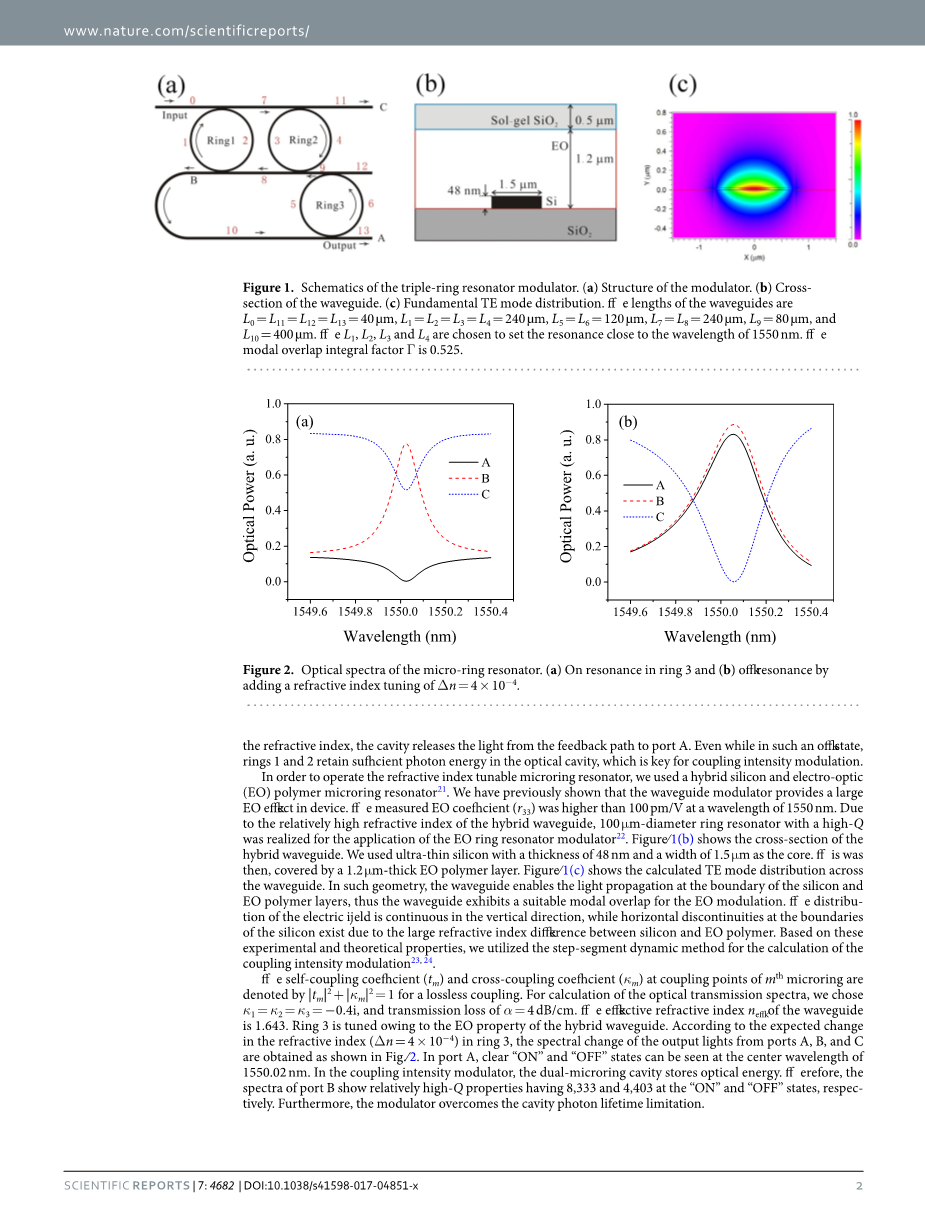 对于无损耗耦合,第m个微环耦合点处的自耦合系数(tm)和交叉耦合系数(қm)用表示。对于透射光谱的计算,我们选择қ1=қ2=қ3=-0.4i, alpha;的透射损耗=4dB/cm。有效折射率neff波导的s是1.643。环3由于混合波导的EO特性而调谐。如图2所示,根据3号环折射率(Delta;n=4x 10-4)的期望变化,得到A、B、C三个端口的输出光的光谱变化。在A端口中心波长1550.02 nm处可以看到清晰的“开”和“关”状态。在耦合光强调制器中,采用双微环腔存储光能。因此,B端口的光谱显示出相对较高的q属性,在“开”和“关”状态下分别为8,333和4.403。此外,该调制器克服了腔光子寿命限制。