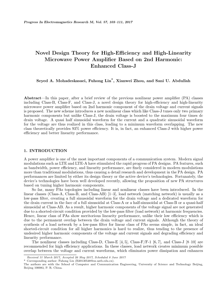 在本文中,我们提出一种新型的J类增强微波功率放大器。在这个类中,上述提到的短路条件限制(如B类功率放大器)和/或在二次谐波纯的电容性负载 (如J类功率放大器)都得到解决。两个漏极电压和电流信号主要的高次谐波得到调整,因此实现漏极电压和电流准半正弦波形的最小可行叠加的出现。最大输出漏极电压可以达到直流漏电压的四倍,提供以较低的直流电源电压去获得更高的输出功率的有利优势。本文提出的类型功率放大器理论上最大漏极效率可达93%。因此,这类功率放大器与J类相比提供了更高的效率,与F/ F – 1类和E类需调谐到三次谐波有所不同,其只需要前两个谐波分量便能使它特别适用于超频高效类应用。