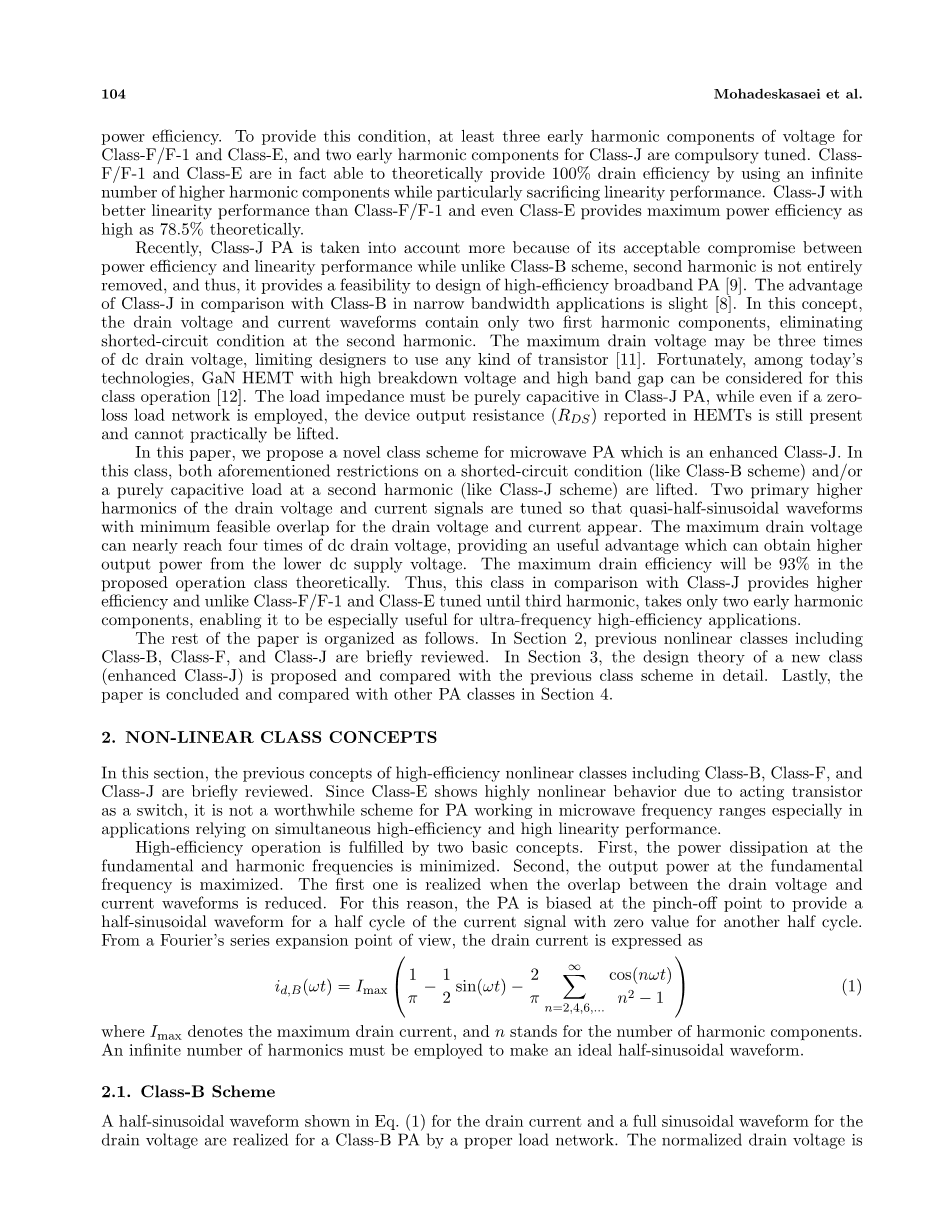 本文剩下的篇幅安排如下。在第二节短暂回顾了包括B类、F类和J类等非线性功率放大器类型。第三节提出了新型设计理论(J类增强型)并且与上述提及的各类进行了较详细的比较。最后 在第四节本文将与其他类功率放大器进行对比,并得出结论。