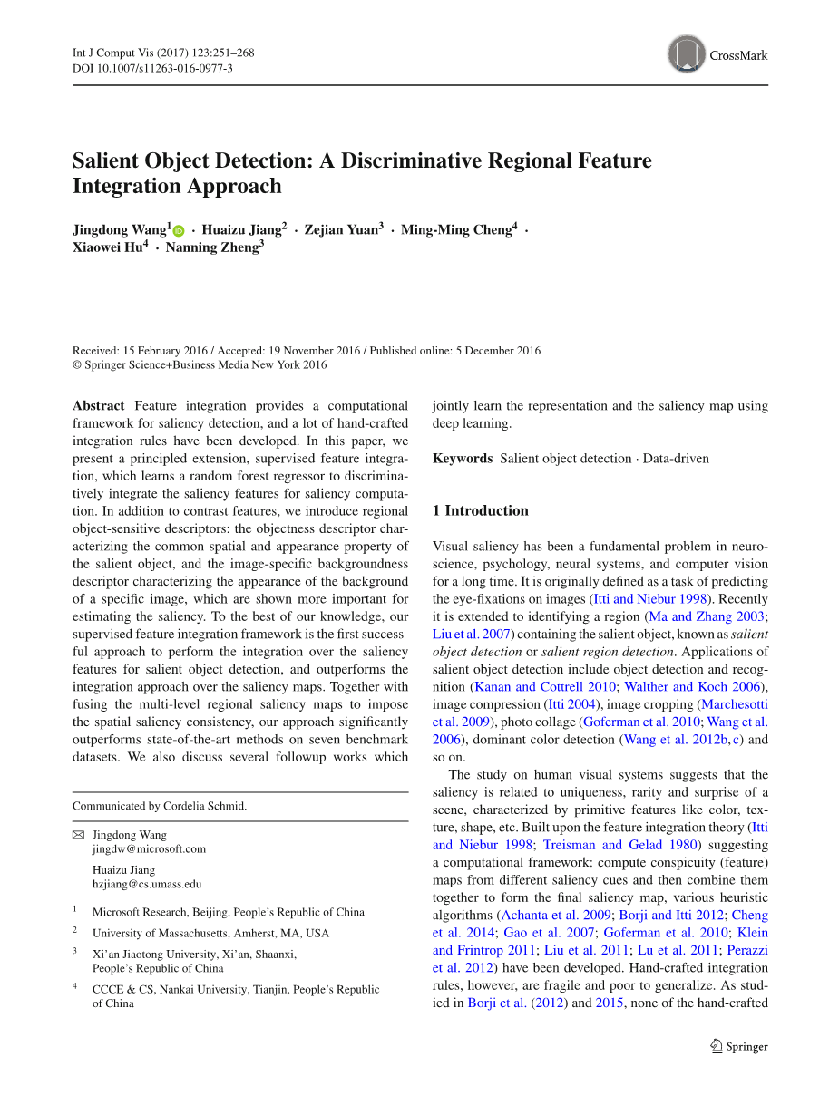 1.提出了一种基于监督特征融合的显著目标检测方法。本文的会议版本(Jiang等人。2013b)是第一个展示了在显著性特征上对显著性目标检测的监管功能集成的成功案例,尽管它很简单,并且启发了许多后续的数据驱动显著性目标检测方法。