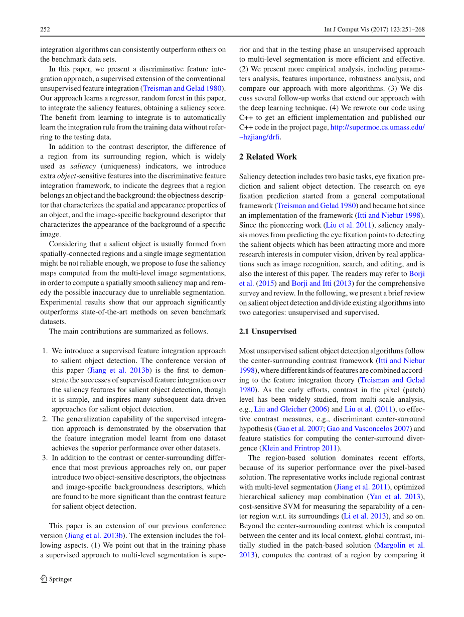 大多数无监督的显著目标检测算法遵循围绕中心的对比度框架(Itti和Niebur 1998),根据特征集成理论(Treisman和Gelad 1980)组合不同种类的特征。作为早期的研究工作,从多尺度分析的角度,Liu和Gleicher(2006)以及Liu等人对像素(斑块)水平的对比度进行了广泛的研究。(2011),有效的对比措施,例如判别中心环绕假设(Gaotal.2007;GaoandVasconcelos2007)和计算中心环绕散度的特征统计(Klein和Frintrop 2011)。