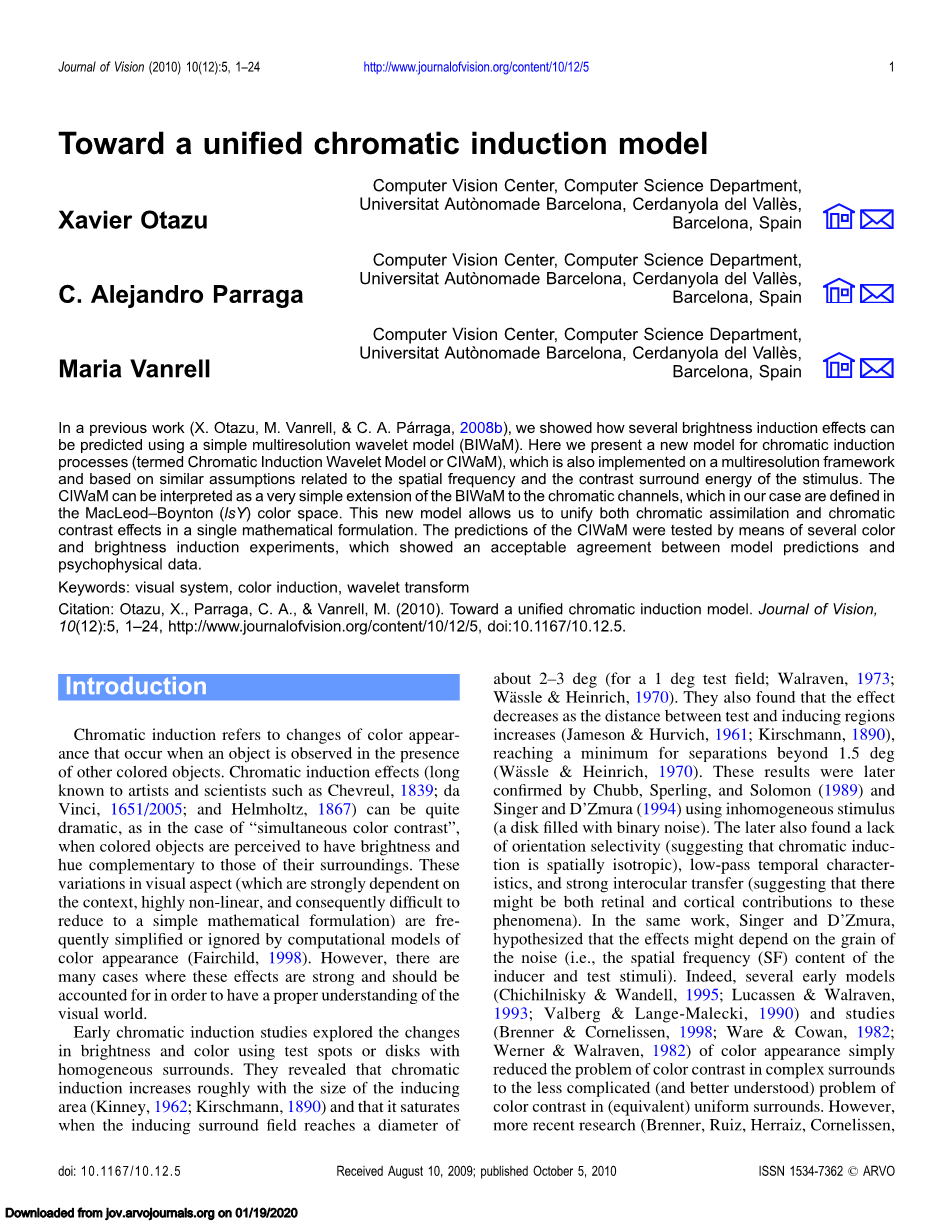 摘要:在之前的工作(X. Otazu, M. Vanrell, amp; C. A. Paacute;rraga,2008b)中,我们展示了如何使用一个简单的多分辨率小波模型(BIWaM)预测几个亮度感应效应。在此,我们提出了一个新的色彩感应过程模型(称为色彩感应小波模型或CIWaM),它也是在一个多分辨率框架上实现的,并基于与空间频率和刺激的对比环绕能量相 关的类似假设。CIWaM可以解释为BIWaM向色彩通道的一个非常简单的扩展,在我们的例子中,色彩通道定义在MacLeod-Boynton (ls)颜色空间中。这个新模型使我们能够将色彩同化和色彩对比效应统一在一个数学公式中。通过几个颜色和亮度感应实验对CIWaM的预测进行了测试,结果表明模型预测和心理物理数据之间存在可接受的一致性。