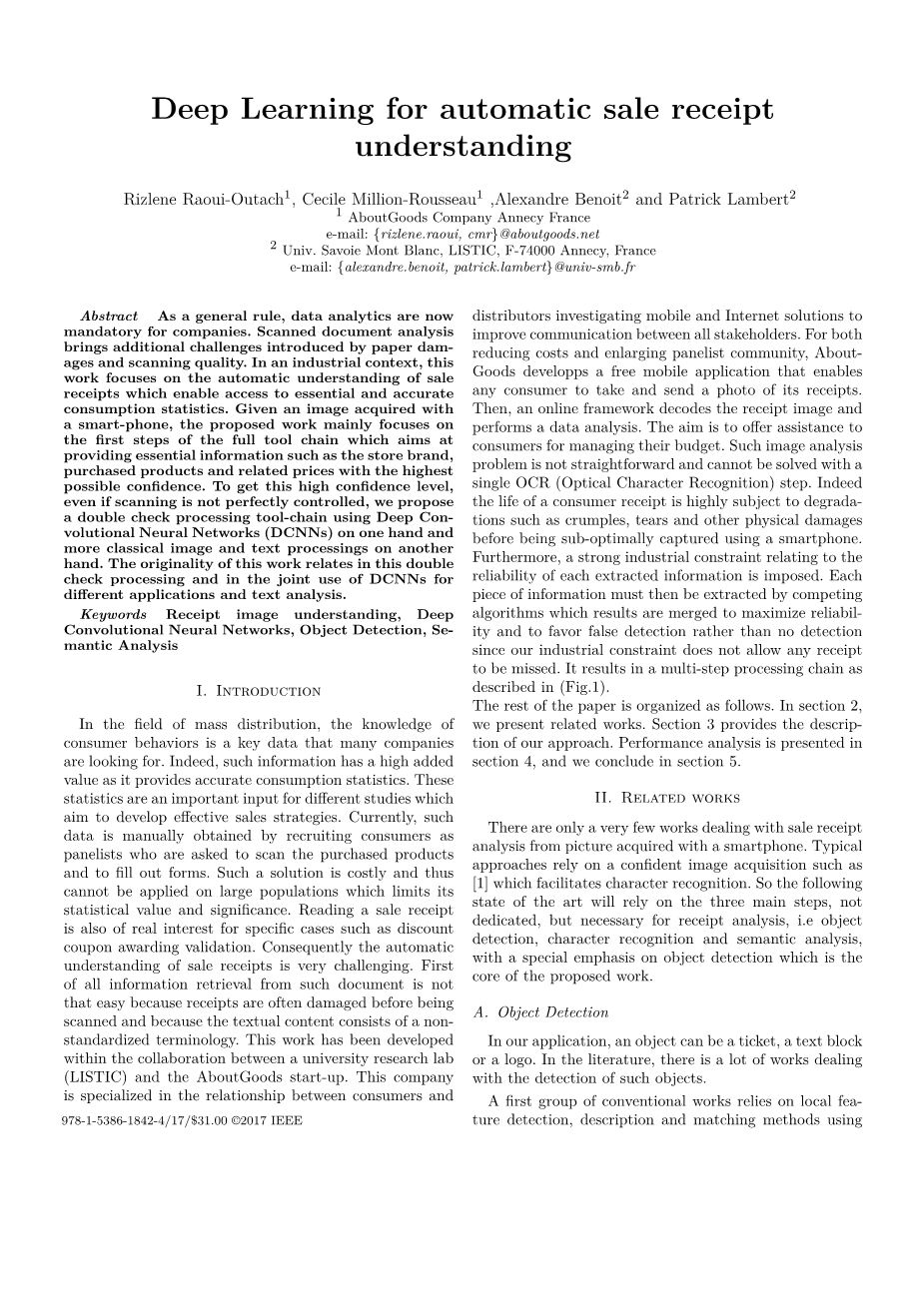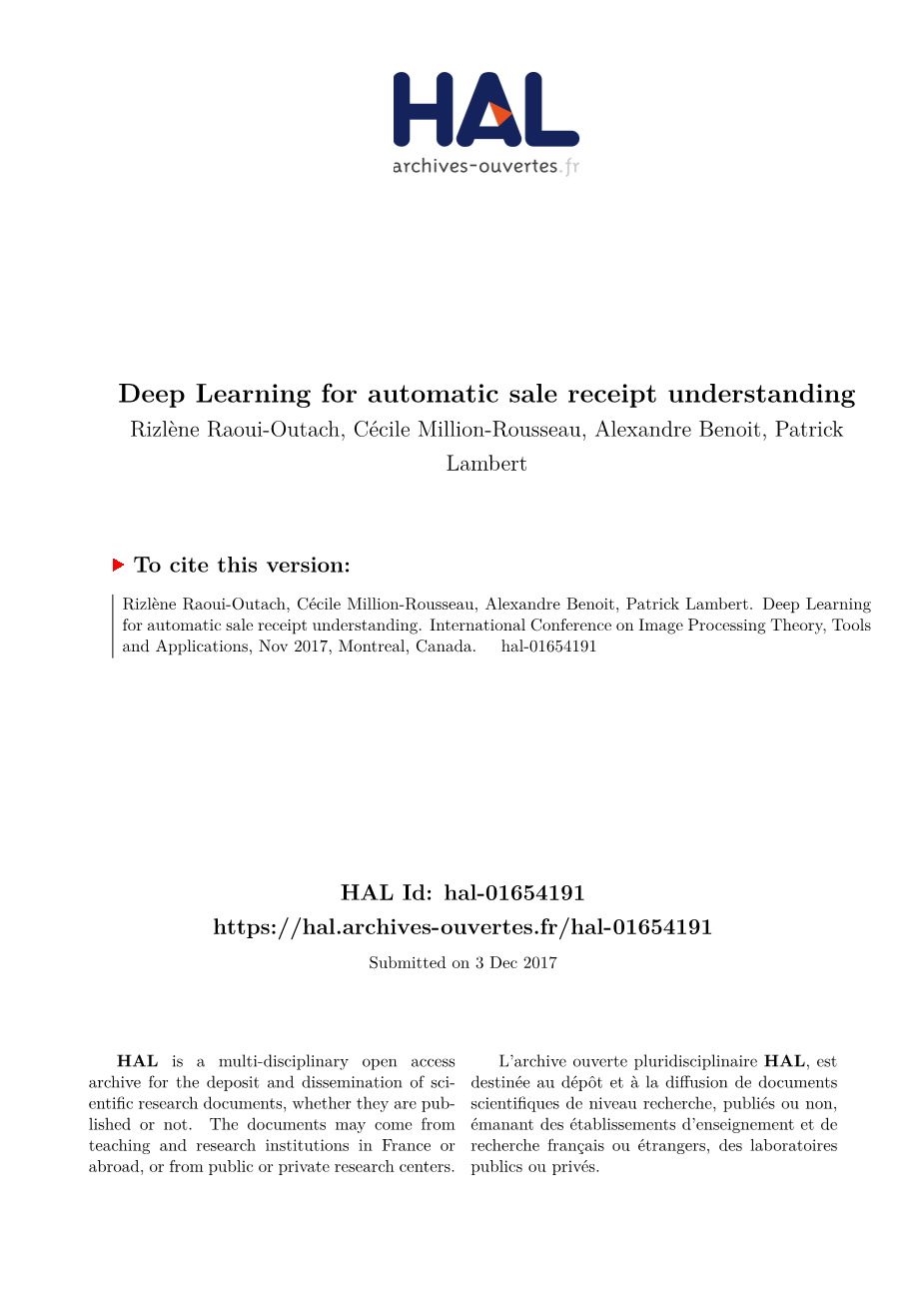 Rizlegrave;ne Raoui-Outach, Ceacute;cile Million-Rousseau, Alexandre Benoit, Patrick Lambert.基于深度学习的自动销售收据的理解。国际图像处理理论会议,工具和应用软件,2017年11月,加拿大的蒙特利尔。hal-01654191