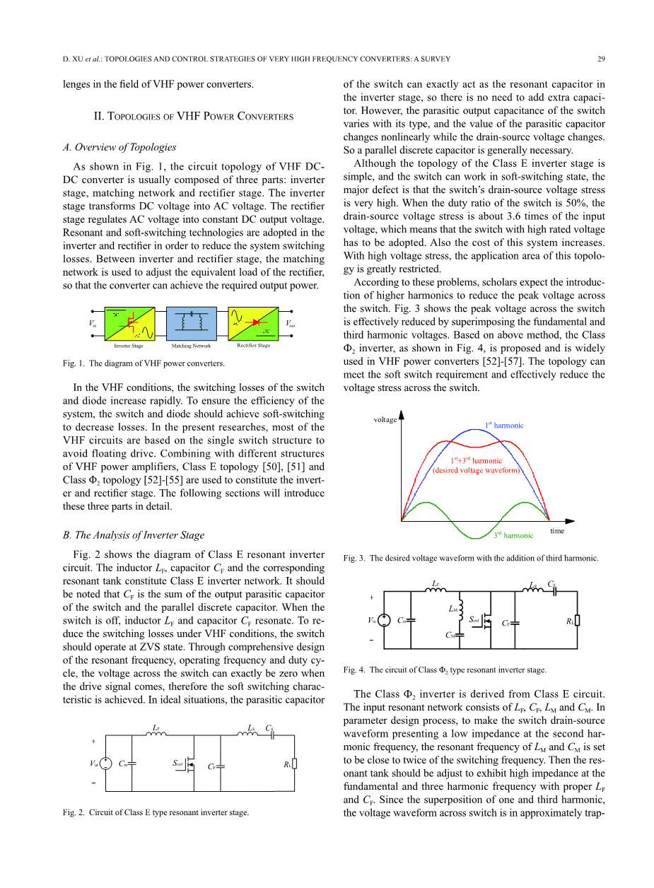 在高频条件下,开关和二极管的开关损耗会大量增加。为了保证系统的效率,开关和二极管应实现软开关以降低损耗。在目前的研究中,大部分的超高频电路都是基于单开关结构,以避免浮动驱动。结合不同结构的超高频功率放大器,采用E类拓扑和phi;2类拓扑构成逆变和整流级。下面几节将详细介绍这三个部分。