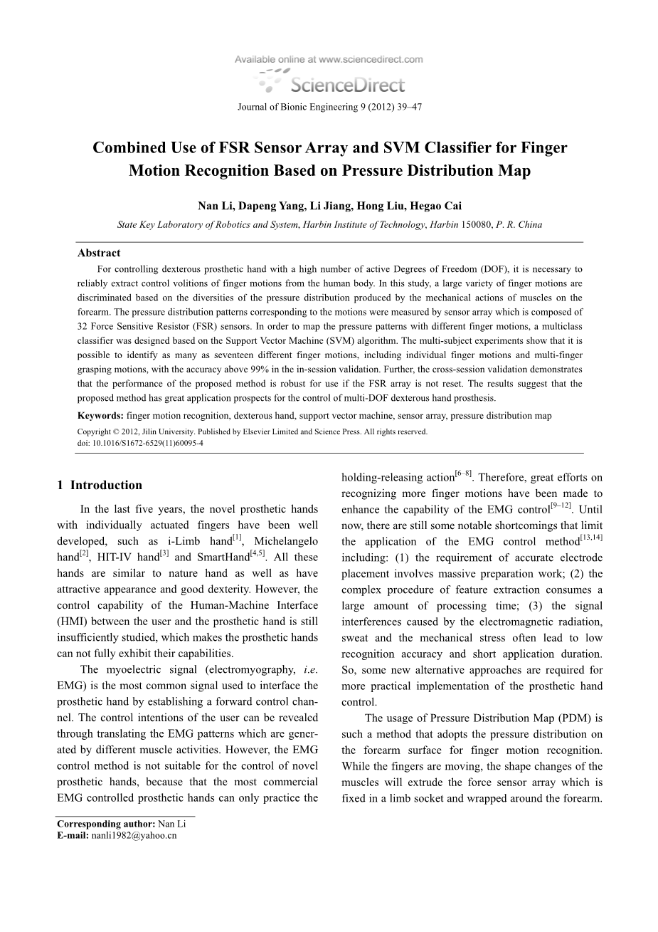 摘要:为了控制具有大量自由活跃度的灵巧假手(DOF),有必要可靠的从人体中提取出控制手指动作的意志。在本次研究中,大量的各种手指的运动识别是基于由肌肉前臂的机械作用所产生的多样性的压力分布。手指运动的压力分布图是由32个力敏电阻(FSR)传感器阵列测量得到。而为了匹配不同的手指运动的压力分布图,设计出了一种基于支持向量机(SVM)算法的多级分类。多学科实验表明它有可能识别出多达17种不同的手指运动,包括单个手指的动作及多手指的抓取动作,在会话验证中有超过99%的准确度。此外,交叉验证会话表明,假如FSR阵列不进行复位将会被强制使用。结果表明,采用这种方法给具有多自由度灵巧手假肢的控制带来了极大的应用前景。