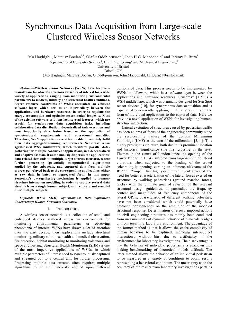 关键词 --无线传感器网络;结构健康监测;同步;数据采集;并发;人力结构;Sensomax;