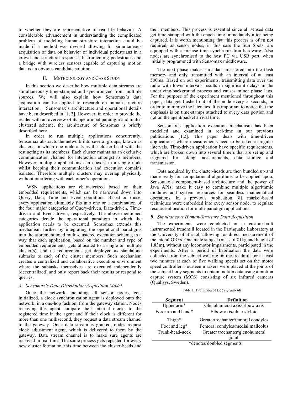 无线传感器网络是一种分散在一个环境中的小型和嵌入式设备的集合,用于监测环境参数或观察感兴趣的现象。无线传感器网络已经吸引了大量的关注,在过去的十年中,他们的应用程序包括结构监测,军事解决方案,健康和医疗观察,火灾探测,监测火山和空间工程的栖息地监测。结构健康监测(SHM)是无线传感器网络的一个最重要的应用,其中感兴趣的多个参数需要同步捕获和输出到一个中央单元进一步处理。处理多个数据流经常需要多个算法同时应用于不同的数据部分。这个过程需要由无线传感器网络的中间件,这是一个软件层之间的应用程序和硬件资源。Sensomax [1,2]是WSN中间设备,它最初被设计为Sun Spot传感器设备[ 10 ],用以同步数据采集,而且能够同时应用多个算法以个人应用的形式捕获的数据。在这里,我们提供了一种新的无线传感器网络应用用以调查人-建筑物的相互作用。