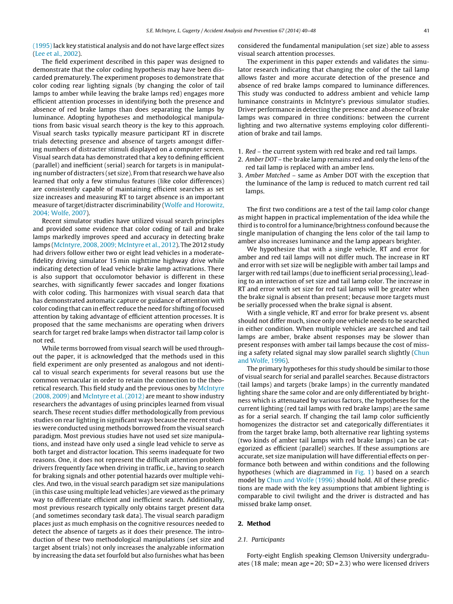 虽然术语借用视觉搜索都会使用纸, 这是承认在这个领域实验中使用的方法只表现为类似的、而不是相同的视觉搜索实验是有几个原因,但使用共同的方言来保持连接的理论研究. 这一领域的研究和之前的麦金太尔(2008、2009)和麦金太尔(2012)是为了显示行业研究人员从视觉搜索使用原则的优点. 这些最近研究的不同方法是前后方照明的重要方式,因为最近进行了的系统使用方法借用了视觉搜索范式. 大多数以前的研究已经不习惯设置大小的操作,也不只使用一辆车作为目标和错误选择的位置,这不足的原因似乎有两个. 一,它不代表司机开车时经常面临交通问题的困难,即在多个车辆的情况下不得不寻找制动信号和其他潜在的危险, 第二,在视觉搜索范式中设置大小操作(在本例中使用多个领导车辆)被视为区分高效和低效搜索的主要方式。此外,大多数以前的研究通常只获得目标显示数据(有时是次要的任务数据). 视觉搜索范式一样强调所需的认知资源来检测目标的缺失以及他们的存在. 引入这两种方法操作(即大小和目标没有试验)不仅增加了数据集可分析的信息,通过增加四倍,还提供了被认为基本操作(设置大小)的是能够评估视觉搜索过程的关注。