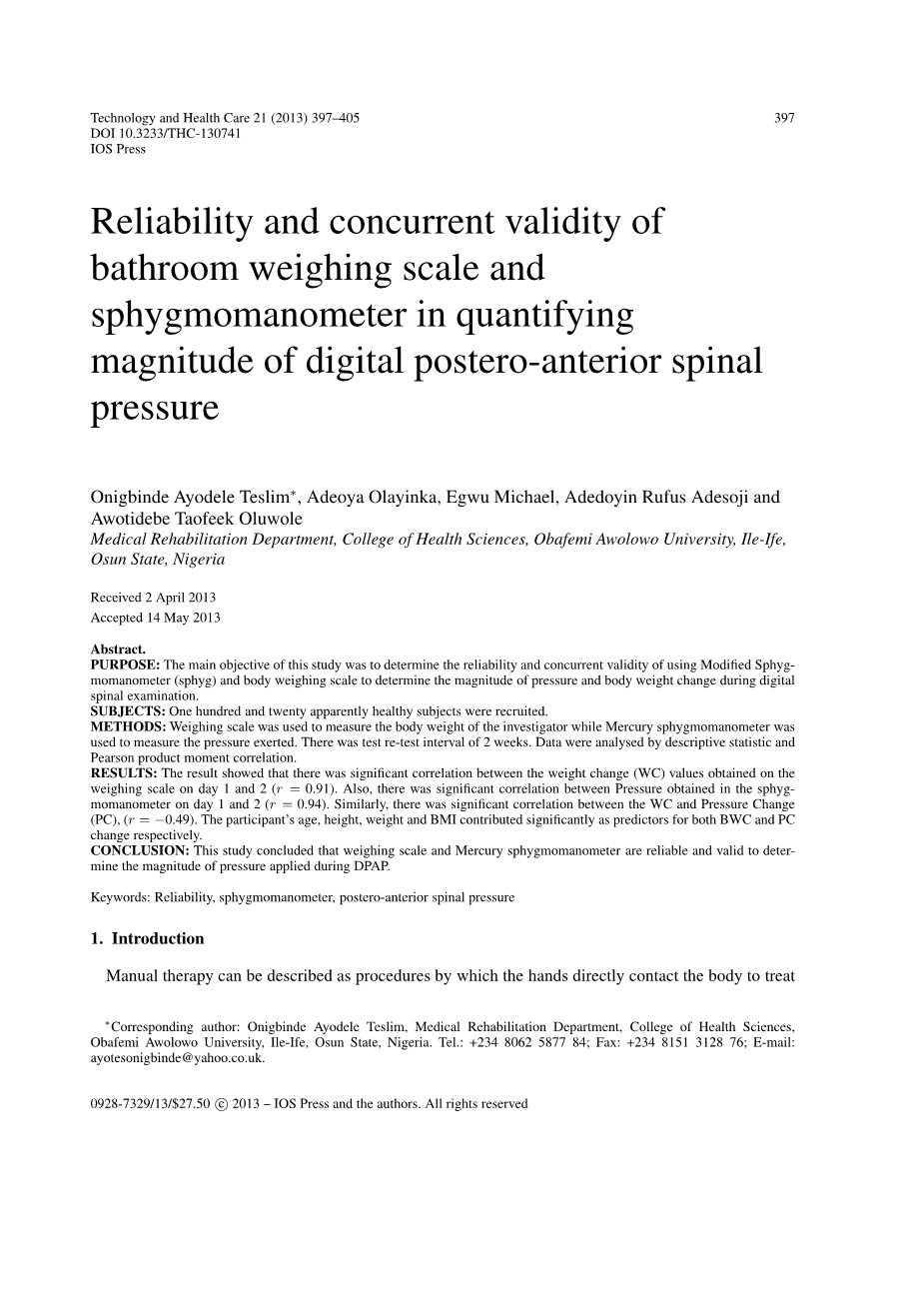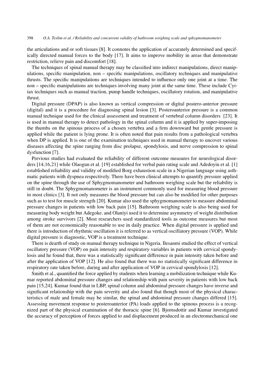 以前的研究已经评估了不同的结果措施的可靠性,神经系统疾病[14,16,21]如Olaogun和Adedoyin等建立了口头疼痛评分量表[1]。通过研究使用尼日利亚语言哮喘患者呼吸困难的分别来建立和修改博格(Brog)疲惫量表的有效性和可靠性。已经有临床尝试通过使用血压计和浴室秤的应用量化对脊柱的压力,但可靠性仍然是个疑问。血压计是一种广泛应用常大多数诊所的用来测量血压的测量仪器。它不仅可以测量血压,也可以在修改后用于其它目的,比如测试肌肉力量。Kumar还用血压计测量腰痛患者腹腔压力的变化[15]。浴室秤也被用于测量体重, Adegoke和Olaniyi用它来确定中风幸存者中的重量分布的对称性[2]。大多数研究人员使用标准化的工具作为结果指标,但他们在日常实践中使用大多是不具有经济性。当使用数字压力时有关于节奏振荡的简介,它被称为垂直振荡压力(VOP)。而数字压力是诊断,垂直振荡压力是一个治疗技术。