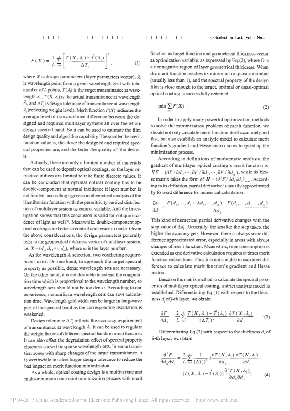 基于矩阵的方法计算光学多层膜的光谱特性,建立了一种理论上的解析模型。它能够对价值函数及其梯度函数和黑塞矩阵基于设计参数的情况下,能够进行绝对精确的计算。从物理的角度来说,这个模型不需要任何额外的假设就可以应用在任何均匀的、各项同性的多层膜系系统中。从数学的角度来说,该模型使用的是无差分近似的方法,这是绝对准确的。对于数值计算方面,模型计算的最大精度可以达到计算机中的浮点运算。理论和仿真结果表明,这种算法具有计算时间短和速度快的特点。因此,它是非常适合于基于价值函数偏导数的局部优化方法的最优方法提高速度和效率的。而其,这种方法在大层数的光学多层膜的设计方面,具有非常