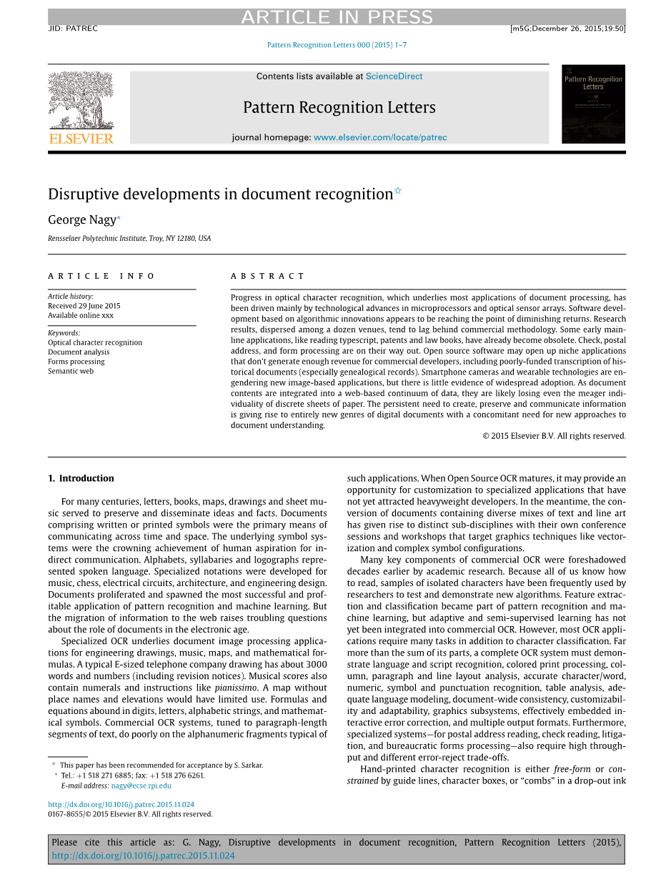 光学字符识别技术的研究进展是应用于文档处理的基础,主要被微处理器和光学传感器阵列的技术进步所驱动。基于算法创新发展的软件开发似乎达到高峰。研究成果,分散在十几个方面,往往落后于商业方法。一些早期的主要应用,如阅读文件,专利和法律书籍,已经过时。支票、邮政地址,综合处理是在他们的出路。开源软件可以有利于基应用,但这并没有为商业开发商带来足够的收入,包括资金不足的历史文献(尤其是家谱)。智能手机摄像头和可穿戴技术正在进行中,创造新的基于图像的应用程序,使技术的广泛采用。作为文件内容集成到一个基于Web的连续数据,它可能会失去不少。持续性需要创建、保存和传达信息,引起完全新的类型的数字文件,同时需要新的方法文字识别。