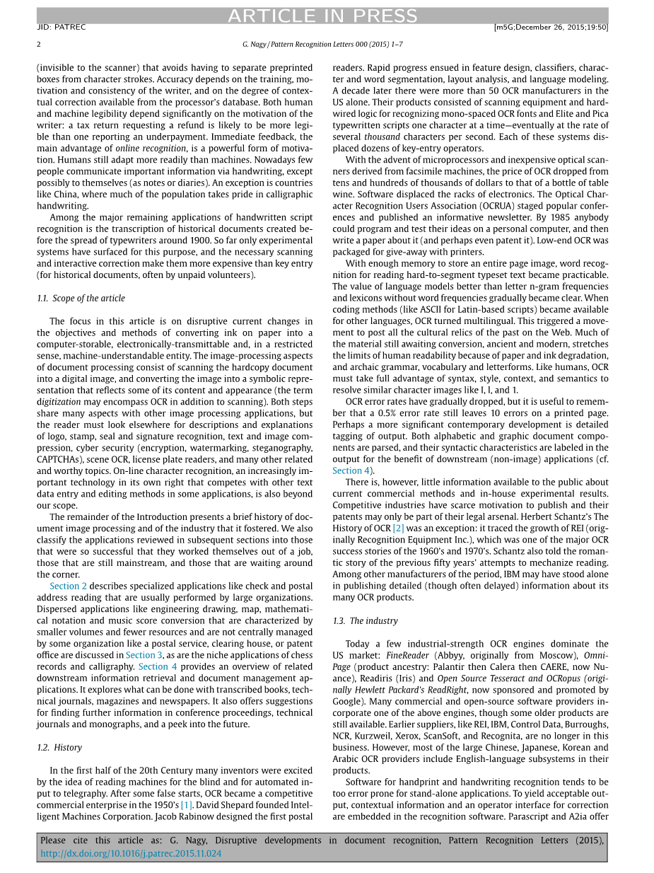 然而,向公众提供关于当前商业内部方法和实验结果都属于小信息。竞争性行业稀缺使得他们动机发布专利可能只是为了法律。赫伯特对OCR的注意力的是历史一个例外: REI (orig-inally识别设备公司),这是一个主要的OCR 1960年代和1970年代的成功故事。他还告诉前面的五十年的浪漫故事是可以实现机械化阅读。其他制造商,IBM可能独自站在发布详细的(虽然经常延迟)许多OCR产品信息。