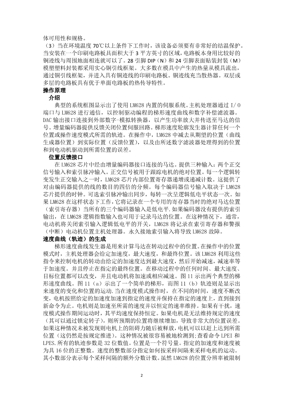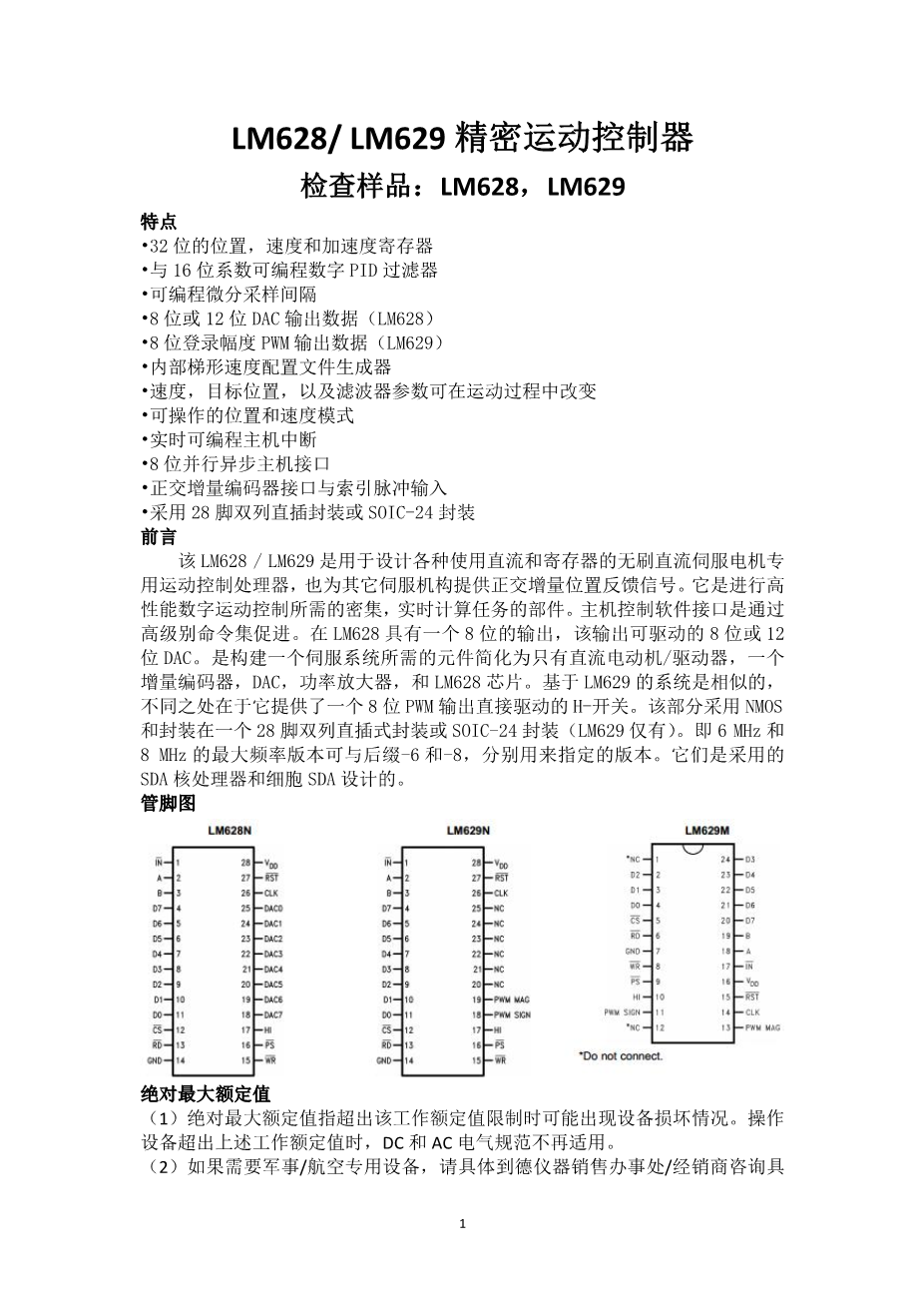 The LM628/LM629 are dedicated motion-control processors designed for use with a variety of DC and Registers brush less DC servo motors, and other servomechanisms which provide a quadrature incremental position feedback signal. The parts perform the intensive, real-time computational tasks required for high performance digital motion control. The host control software interface is facilitated by a high-level command set. The LM628 has an 8-bit output which can drive either an 8-bit or a 12-bit DAC. The components required to build a servo system are reduced to the DC motor/actuator, an incremental encoder, a DAC, a power amplifier, and the LM628. An LM629-based system is similar, except that it provides an 8-bit PWM output for directly driving H-switches. The parts are fabricated in NMOS and packaged in a 28-pin dual in-line package or a SOIC-24 package (LM629 only). Both 6 MHz and 8 MHz maximum frequency versions are available with the suffixes -6 and -8, respectively, used to designate the versions. They incorporate an SDA core processor and cells designed by SDA.