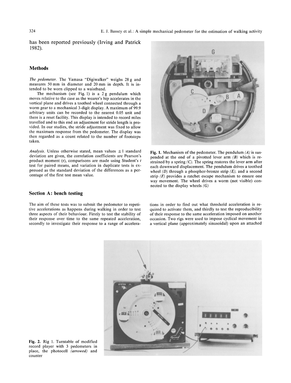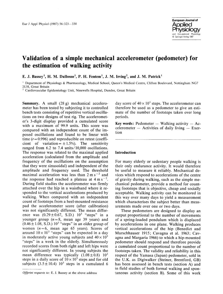 对于许多老年人或久坐不动的人来说走路是他们唯一锻炼耐力的活动。因此它应该可以被准确地测量。对行走过程中反应引力的加速的机械设备比如简单的机械计步器提供了一个客观的统计步数的方法,价格便宜并且在社会上可被接受。步行活动可以以这种方式监控许多天来表示这个测量方法比测量一两天要好。这个计步器被设计用来显示用来取代飞机上的加速度计的弹簧钟摆的运动输出比例。步行产生了对臀部的垂直加速度(本尼迪克和麦斯豪尔 1915;卡瓦尼亚等人.1963;卡瓦尼亚和马加利亚 1966)而安装在臀部的计步器应该做出反应因而提供一个对步数的累积计数比例。以有效性和可靠性著称的Yamasa(日本)计步器在英国销售,同时数字步行者(斯坦纳,布伦特福德 ,GB)已经被在小型试验(A区域)和日常行走以及自发性活动的野外调查(B区域)中验证过了。这项工作中的一部分已经在以前被报告过了(欧文和帕特里克1982)。