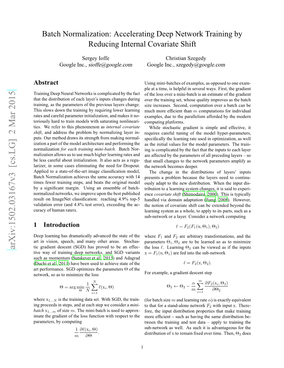 在深度神经网络的训练过程中,先前层参数的调整会导致之后每一层输入值的分布发生变化,这种现象使模型的训练变得很复杂。所以在深度神经网络模型的训练中,通常需要仔细选取初始参数并采取较小的学习率,这不但导致模型训练的效率低下,而且使得饱和非线性模型的训练极为困难。我们把这种现象称为内部协变量转移(covariate shift),并通过归一化(normalizing)每层的输入来解决这个问题。我们方法的强大之处在于把归一化的步骤作为模型训练架构的一部分来实现, 并且对每个训练小批量都执行归一化操作。批量归一化允许我们使用很高的学习率并且对初始化不太在意。它在一定情况下也可以起到正则化的作用,并减轻了对Dropout的需求。我们在最先进的图像分类模型中使用批量归一化法,在减少了14倍训练步骤的情况下实现了与原模型相同的精度,并以显著增量击败了原始模型。我们使用批量归一化的网络模型,增强了在ImageNet分类上发布的最佳结果:获得了4.9%前5验证误差(和4.8%测试误差),这超出了人类评估者的准确率。