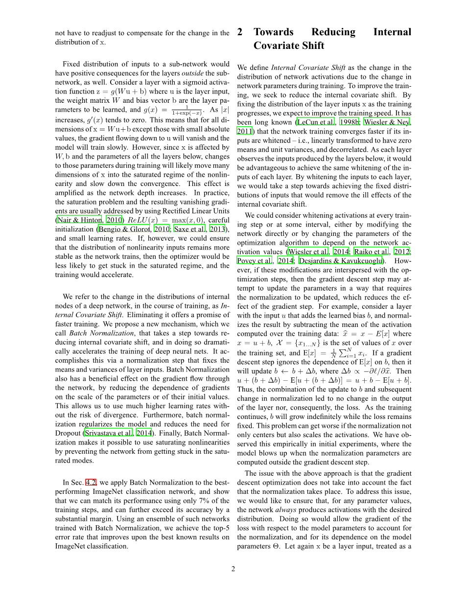 固定一个子网络输入的分布将对子网络外的层产生积极的影响。用一个sigmoid激活函数z=g(Wu b)考虑一个层,其中u是层输入,权重矩阵U和阈值是学习的层参数,因为X是受W,b和下面所有层参数的影响,在训练期间对这些参数的改变将可能将X的许多维度移动到非线性的饱和状态并且收敛减慢。这种效果是随着网络的深度的增加而放大的。在实际应用中,饱和问题(saturationproblem)和导致的消失梯度通常通过使用Rectified Linear Units(ReLU)来解决。ReLU(x)=max(x,0),仔细的初始化和小的学习率。然而,如果我们可以确保非线性输入的分布在网络训练时保持更加稳定,那么优化将不太可能在饱和状态中停滞,并且训练将加速。