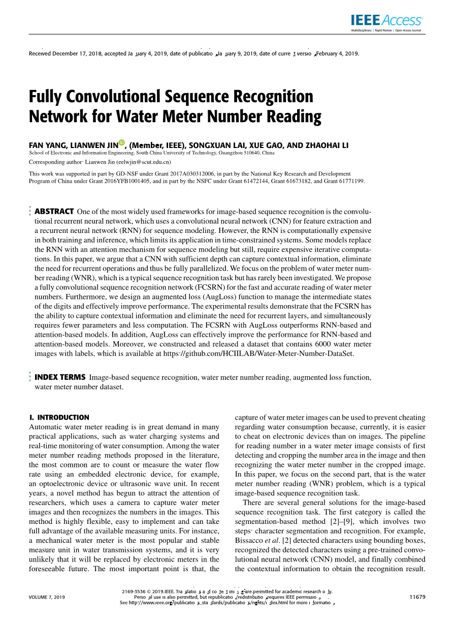 在许多实际应用中需要自动水表读数,例如充水系统和耗水量的实时监测。在文献里提出的水表数字读取方法中,最常见的是使用嵌入式电子设备(例如,光电设备或超声波单元)来计算或测量水流量。近年来,一种新方法开始引起研究人员的注意,他们使用相机捕获水表图像,然后识别图像中的数字。该方法灵活性高,易于实施,可充分利用现有的测量单元。例如,机械式水表是水传输系统中最受欢迎和最稳定的测量单元,在可预见的将来它不太可能被电子仪表取代。最重要的一点是,水表图像的捕获可以用于防止关于水消耗的欺骗,因为目前在电子设备上欺骗比在图像上更容易。用于读取水表图像中的数字的管道包括首先检测并裁剪图像中的数字区域,然后识别裁剪图像中的水表数量。在本文中,我们重点关注第二部分,即水表数字读数(WNR)问题,这是一种典型的基于图像的序列识别任务。