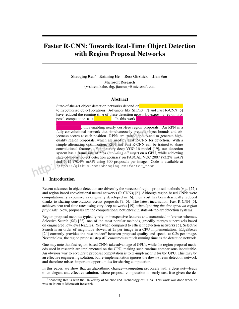 最先进的目标检测网络依赖区域生成算法去假设对象位置。SPPNET和Fast R-CNN等技术的进步减少了这些检测网络的运行时间,使区域生成计算成为一个瓶颈。在这项工作中,我们引入了一个区域生成网络(RPN),它与检测网络共享全图像卷积特性,从而实现了几乎无损耗的区域建议。RPN是一个完全卷积的网络,它同时预测每个位置的对象边界和对象性得分。RPN经过端到端的训练,生成高质量的区域建议,由Fast R-CNN用于检测。通过简单的交替优化,RPN和快速的R-CNN可以被训练来共享卷积特征。对于深度VGG-16型号,我们的检测系统在GPU上的帧速率为5fps(包括所有步骤),同时在Pascal VOC 2007(73.2%mAP)和2012(70.4%mAP)测试集的每张图片上使用300个图像方案实现最先进的目标检测精度。
