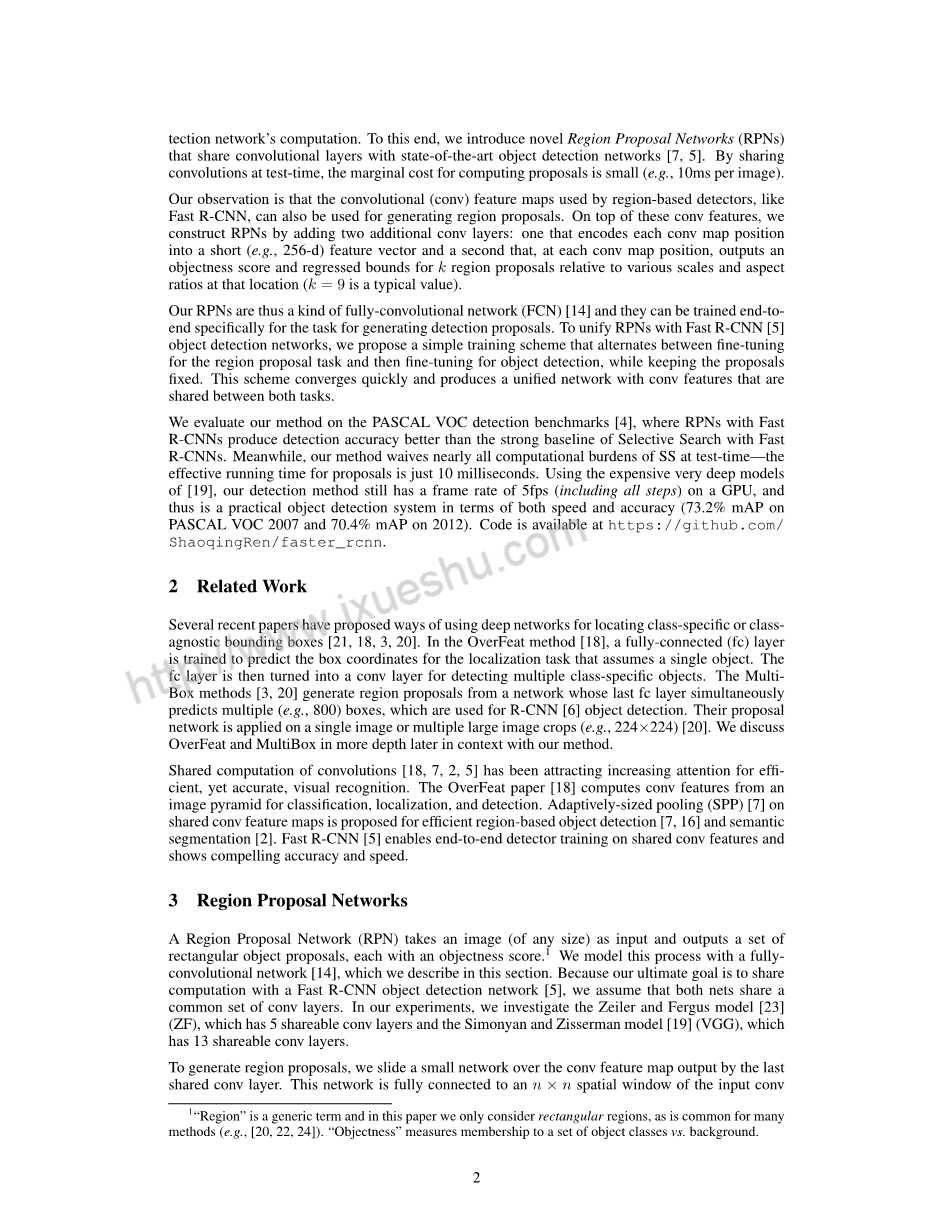 卷积[9],[1],[29],[7],[2]的共享计算已经越来越受到人们的关注,因为它可以有效而准确地进行视觉识别。OverFeat论文[9]计算图像金字塔的卷积特征用于分类,定位和检测。共享卷积特征映射的自适应大小池化(SPP)[1]被开发用于有效的基于区域的目标检测[1],[30]和语义分割[29]。Fast R-CNN[2]能够对共享卷积特征进行端到端的检测器训练,并显示出令人信服的准确性和速度。