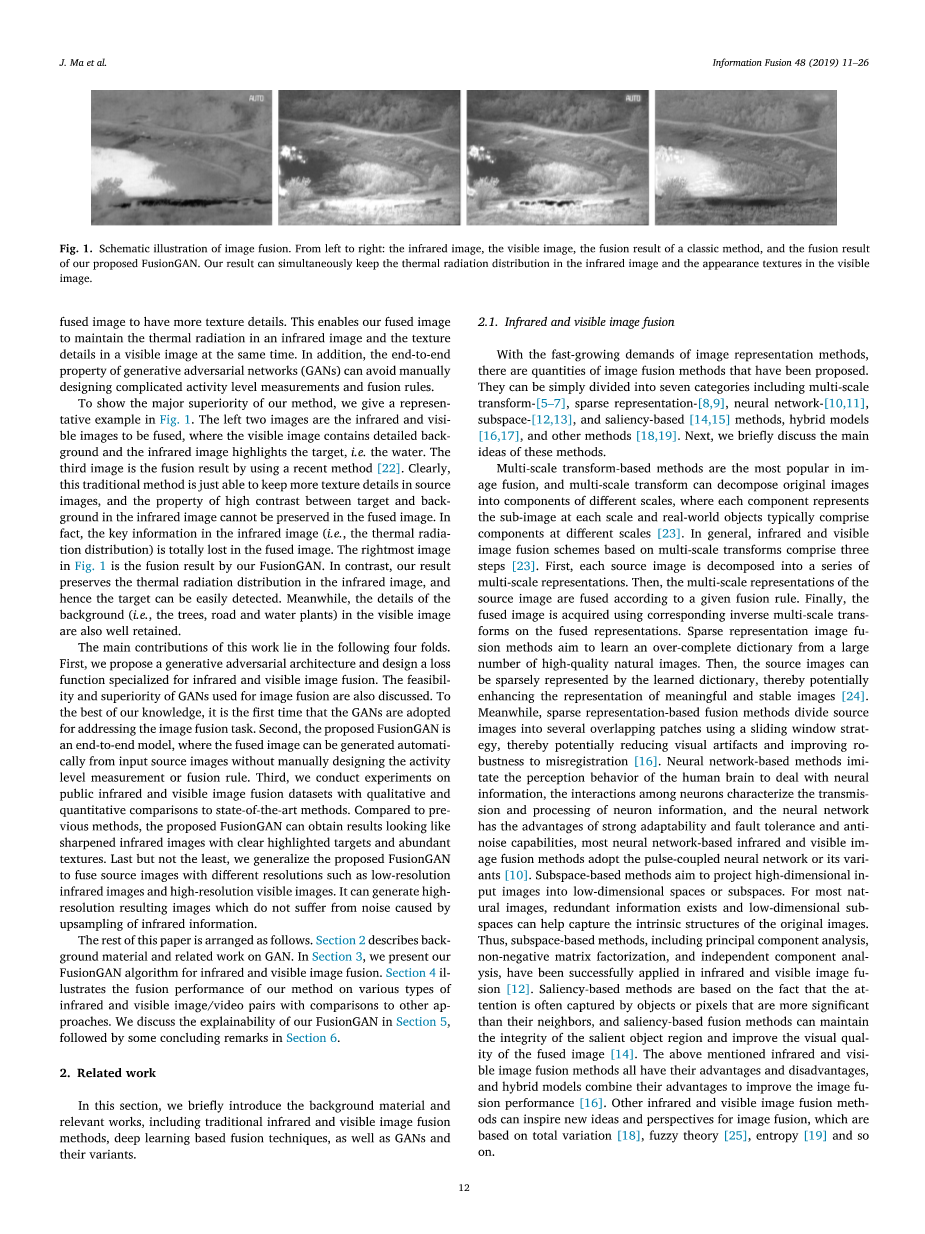 本文的其余部分安排如下。第2节描述了GAN的背景材料和相关工作。在第3节中,我们介绍了用于红外和可见图像融合的FusionGAN算法。第4节说明了我们的方法在各种类型的红外和可见图像/视频对上的融合性能,并与其他方法进行了比较。我们在第5节中讨论了FusionGAN的可解释性,然后是第6节中的一些结束语。