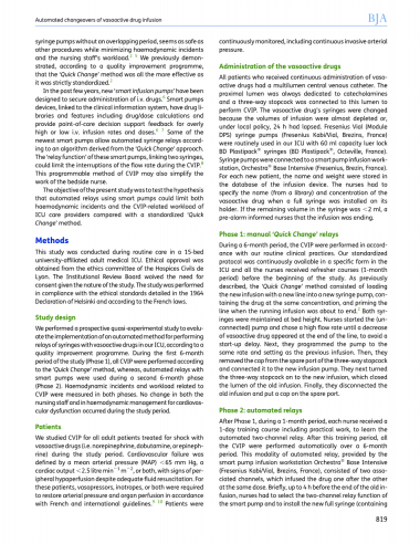 根据一项质量改进计划,我们进行了一项前瞻性准实验研究,以评估一种自动化方法在重症监护室中执行血管活性药物注射器接力的实施情况。在研究的前6个月(第一阶段),所有的切换都按照“快速切换”的方法进行,而在第二阶段中,则使用带有智能泵的自动接力,两个阶段都测量了与切换相关的血液流速异常事故和工作量。研究期间,护理人员和心血管功能障碍的血流管理均未发生变化。