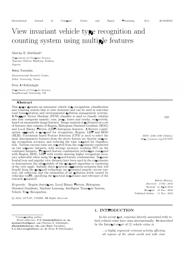摘要:本文提出了一种视图不变、可用于实时道路交通和环境污染管理系统的自动车型识别、分类和计数系统。采用支持向量机(SVM)分类器将车辆分为四类;汽车、吉普车、公共汽车和卡车,分别基于可测量的图像特征。对一组由区域、方向梯度直方图(HOG)和局部二值模式(LBP)直方图组成的特征集进行图像分析,提出了一种特征组合识别方法;区域,LBP和HOG。利用相关特征选择(CFS)从上述特征集中选择最具鉴别性的特征,提高识别精度,减少分类所需时间。在这两个独立的数据集上进行的实验报告了不同的成功率,组合数据集的平均准确率达到95%。与区域、HOG、LBP相比,提出的特征组合技术具有更高的识别精度。实验中分别使用了前后视图和角度视图数据集,验证了该算法对视角变化的适应性。初步提出了三种可从该技术中获益的实际应用场景:出入管制、收费和估计交通车辆所引致的空气污染水平,以及证明该研究的实际可操作的重要性和相关性。