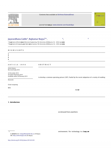 计算机时代的下一次浪潮将超越传统桌面屏幕操作的范畴。在物联网(IoT)范例中,我们周围的许多物体将以某种形式存在于网络中。信息和通信系统将无形地嵌入我们周围的环境中,射频识别(RFID)和传感器网络技术将迎接这一新的挑战。这就产生了大量的数据,这些数据必须以无缝、高效和易于解释的形式进行存储、处理和呈现。这种模式将包括商品服务,并以类似于传统商品的方式交付。云计算可以为这种高效计算提供虚拟基础设施,它集成了监控设备、存储设备、分析工具、可视化平台和客户端交付传输。云计算提供的基于成本的模型将为企业和用户提供端到端服务供应,以便随时随地访问应用程序。