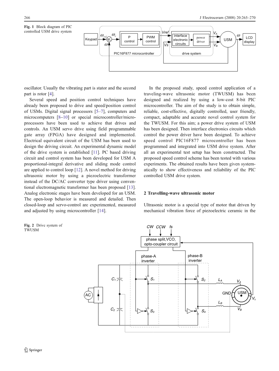 已经有几种速度和位置控制技术被提出,用来驱动USMs或控制它的速度和位置。数字信号处理器[5-7],计算机和微型计算机[8-10]或特殊的微控制器/微处理器已经被用来实现驱动和控制。利用现场可编程门阵列(FPGA)设计和实现了一种USM伺服驱动器。利用USM的等效电路设计了驱动电路。还建立了驱动系统的实验动力学模型[11]。基于PC机的驱动电路和控制系统已经为USM开发了一个比例积分微分和滑模控制应用于控制回路[12]。提出了一种利用压电变压器代替直流/交流变换器驱动超声波电机的方法[13]。模拟电子阶段是为USM开发的。开环的行为是测量和详细的。然后用微控制器对闭环和伺服控制进行实验、测量和调整[14]。