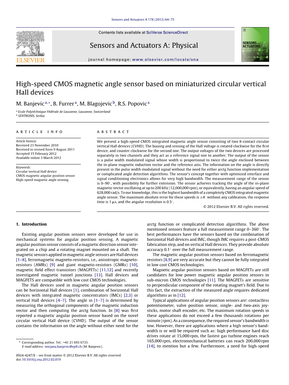 本文提出了一个由两个8触点圆形垂直霍尔器件(CVHD)组成的高速CMOS集成磁角传感器。第一个器件的霍尔电压的偏置和感应顺时针旋转,第二个器件逆时针旋转。两个器件的输出电压在两个通道中分开处理,它们相互作为参考信号。传感器的输出是脉宽调制信号,其宽度与面内磁感应矢量和参考轴之间的夹角成正比。关于角度的信息直接存在于脉宽调制信号中,无需使用arctg函数或复杂的角度检测算法。传感器的概念以及优化的接口和信号调节电子元件可实现非常高的带宽。传感器的测量范围为0-90°,可以进一步扩展。该传感器实现了跟踪以高达200kHz(12,000,000rpm)振荡的面内磁矢量的角度,或者等同地具有628,000rad/s的角速度。据我们所知,这是完全CMOS集成磁角传感器的最高带宽。这些速度的最大绝对误差为plusmn;4°,没有任何校准,响应时间为1s,角度分辨率为0.5°。
