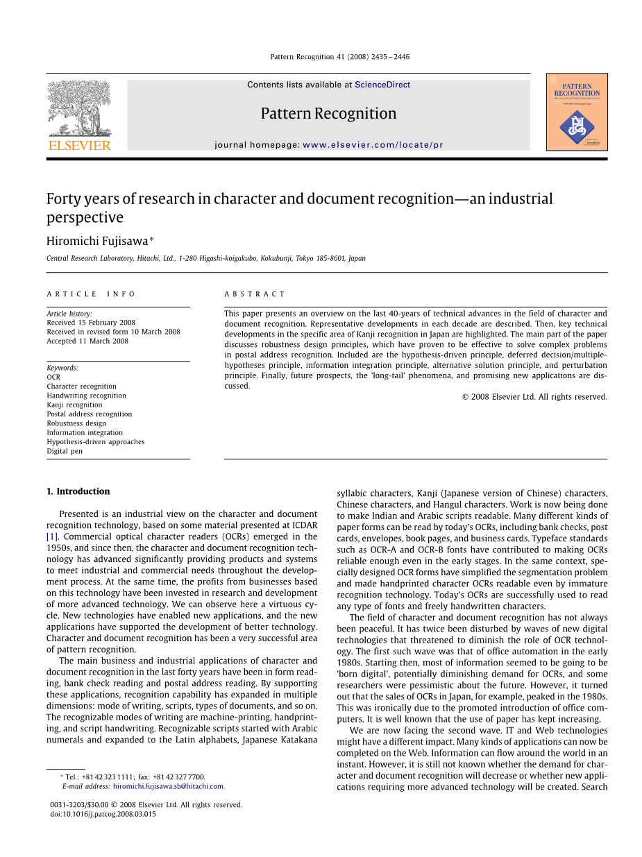本文概述了字符和文档识别领域最近40年的技术进步。描述了每个十年的代表性发展。然后,重点介绍日本汉字识别特定领域的关键技术发展。本文的主要部分讨论了鲁棒性设计原则,这些原则已经被证明有效解决邮政地址之别中的复杂问题。包括假设驱动原则,延迟决策/多重假设原则,信息集成原则,替代解决原则和微扰原理。最后,讨论未来的前景,“长尾”现象以及有希望的新应用。