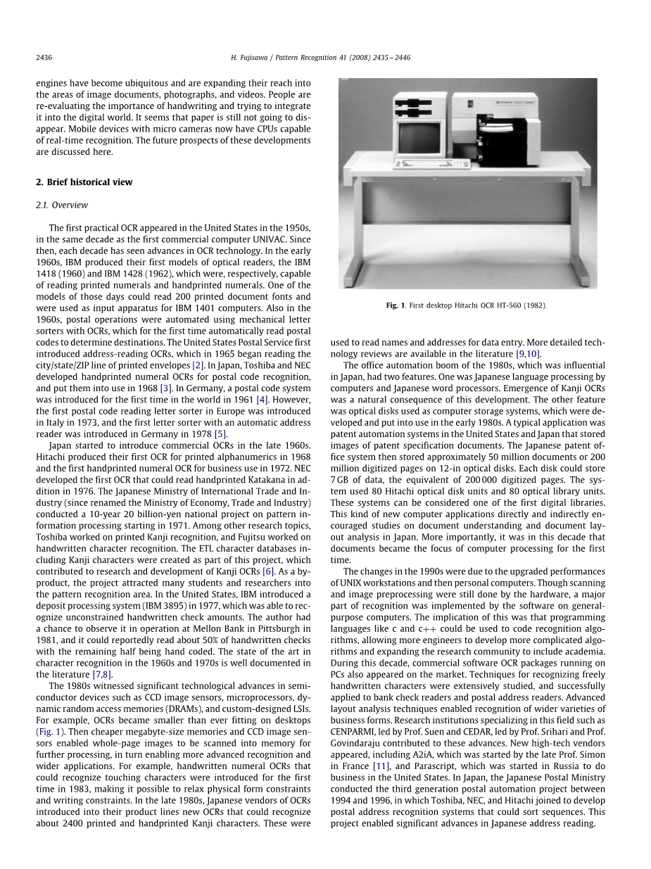 日本在20世纪60年代后期开始引入商业OCR。日立在1968年制作了第一个用于打印字母数字的OCR,并在1972年制作了第一个用于商业用途的手写数字OCR。NEC于1976年开发了第一款可以读取手写纸片假名的OCR。日本国籍贸易和工业部(已改名为Ministry经济产业研究所)从1971年起开展了为期10年的200亿日元的图案信息处理项目。在其他研究课题中,东芝从事印刷汉字识别工作,富士通从事手写字符识别工作。包括汉字字符的ETL字符数据库是作为该项目的一部分而创建的,该项目有助于汉字OCR的研究和开发。作为副产品,该项目吸引了许多学生和研究人员进入模式识别领域。在美国,IBM于1977年推出了存款处理系统(IBM 3895),该系统能够识别无约束的手写支票金额。作者有机会在1981年在匹兹堡的梅隆银行观察它的运行情况,据报道它可以读取大约50%的手写支票,其余的一半是手写的。文献【7,8】详细记载了20世纪60年代和70年代的字符识别技术。