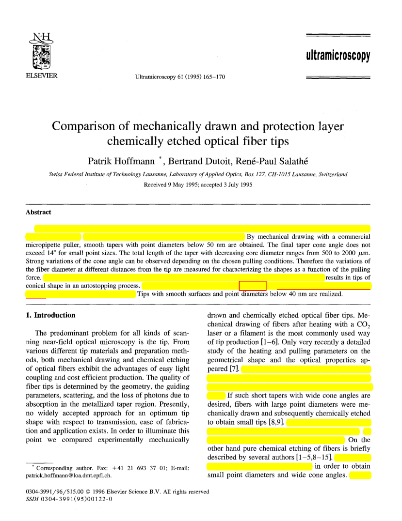 扫描近场光学显微镜尖端是通过对标准单模光纤进行机械拉伸和化学蚀刻而产生的。比较两种方法的几何形状和锥角。通过使用商用微量吸管拉拔器进行机械拉伸,获得点直径低于50nm的光滑锥形尖端。小点的最终锥角不超过14°。锥度在减小的芯径总长度范围为500至2000mu;m。取决于所选择的拉伸条件,可以观察到锥角的强烈变化。因此,测量纤维直径在针尖不同距离处的变化来表征形状与拉力的函数关系。 在覆盖有有机溶剂保护层的40%氢氟酸水溶液中的化学蚀刻在自动停止过程中产生圆锥形尖端。通过在静态蚀刻条件下适当选择有机溶剂,锥角可以从8°变化到41°,还可以制造具有光滑表面和点直径小于40nm的尖端。