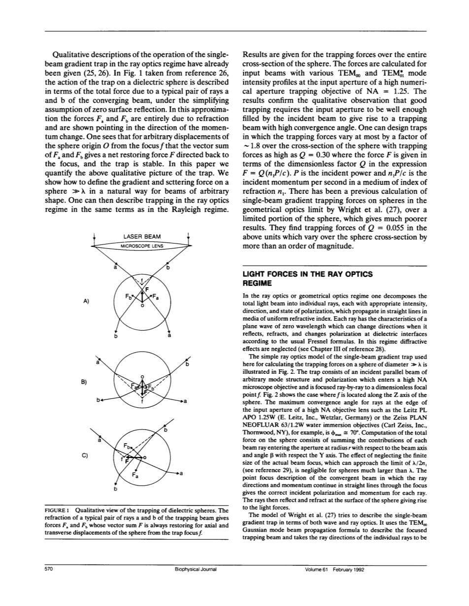 在射线光学系统中,对单个光束梯度陷阱的定性描述已经给出了。在图1中,在零表面反射的简化假设下,在一个介电球上的陷阱的作用被描述为由于一个典型的射线a和b的会聚光束的总力。在这个近似中,Fa和Fb完全取决于折射率,并指向动量变化的方向。我们可以看到,对于球体原点0的任意位移,Fa和Fb的矢量和得到一个净恢复力F指向焦点,并且陷阱是稳定的。在本文中,我们量化了上述陷阱的定性图像。我们展示了如何以自然的方式定义一个远大于波长的球体在任意形状的光束作用下的梯度力和散射力。然后,我们可以用与瑞利(Rayleigh)粒子相同的术语来描述在射线光学系统中捕获的陷阱。结果给出了在球体的整个横截面上的俘获力。在高数值孔径捕获目标NA = 1.25的输入孔径上,并在不同的TEM模式光强分布下计算了力,实验结果证实了该方法的定性结果,即入射光的输入孔径要足够满足入射束的要求,从而使入射光束具有较高的会聚角。我们可以设计这样一种阱,其中捕获力在球体的横截面上最多变化1.8倍,捕获力高达Q = 0.30,其中力F按照表达式中的无量纲因子Q给出 F = Q(n1*P / c),其中P是入射功率,n1*P/c是在折射率为n1的介质中的每秒入射动量。Wright等人已经在几何光学极限的球面上有过单光束梯度俘获力的计算,在球面有限的部分结果更差。他们发现在上述单位中Q = 0.055的捕获力情况下,在球体横截面上的变化超过一个数量级。