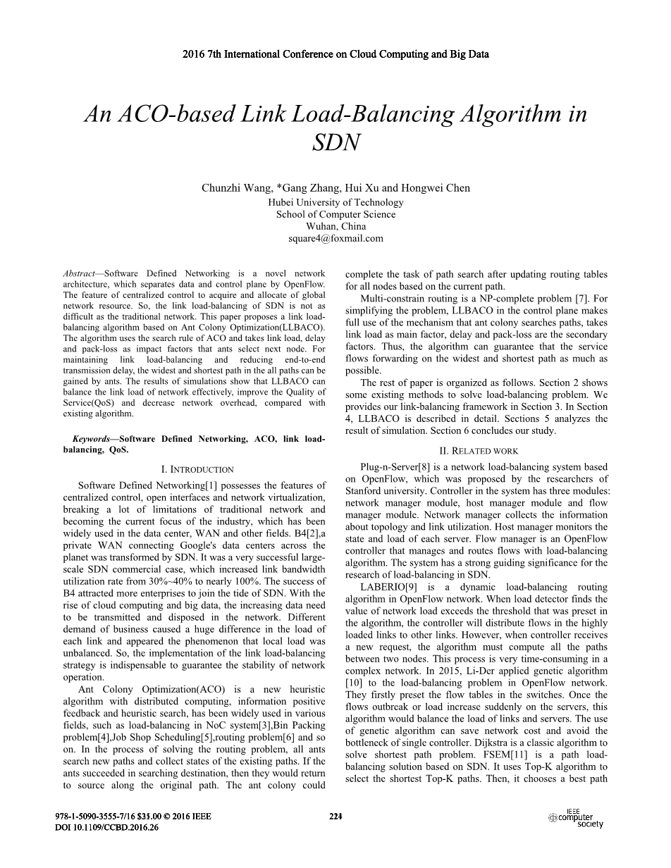 关键词 - 软件定义网络,ACO,链路负载平衡,QoS。