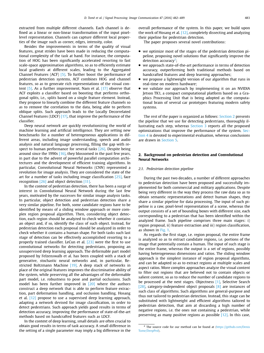 本文的其余部分组织如下:第2节介绍我们用于检测行人的流程,详细说明每一步,而第3节报告所有提议的优化,以改善系统的性能。第4节致力于实验评估,而第5节则得出结论。