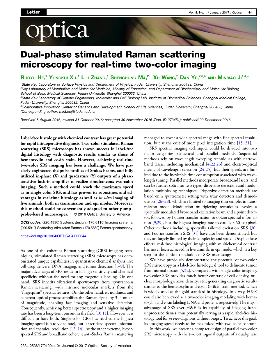 总结而言,我们设计了一个紧凑简洁的、具有精确时间管理的双色SES显微术装置,它可以通过双相锁相放大器X和Y输出通道来同时探测两个拉曼频率。我们演示了在培养细胞、组织切片和活动物成像中的原理论证结果,包括传输和后向两种成像模式。我们的方法提供了一个简单的方法来实现实时双色SRS成像,并且,它可以在生物医学研究中找到新的发展潜力。