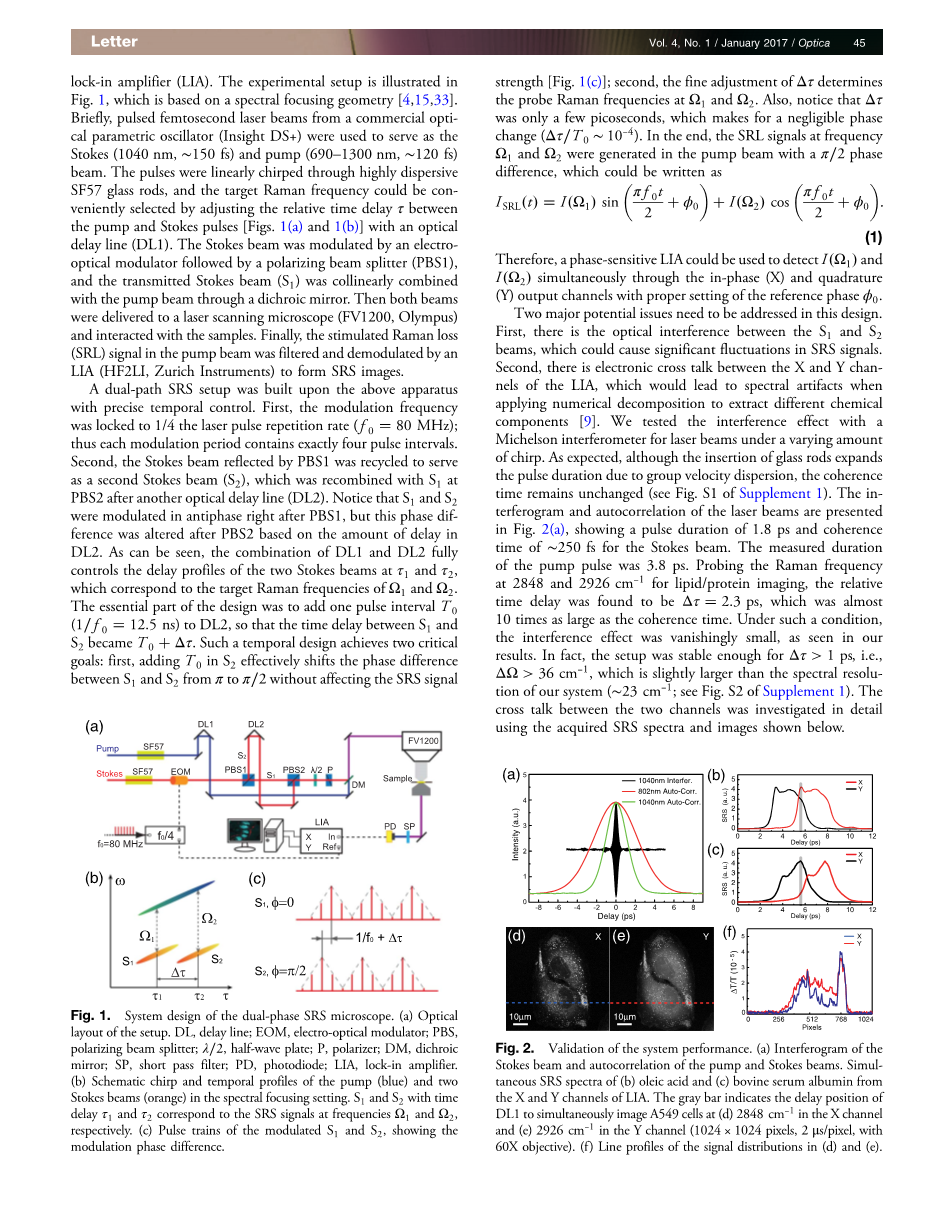 在这次工作中,我们展示了一个简洁的、有两个正交输出的双相锁相放大器的并排双色SRS显微术设计。基于光谱聚焦几何的实验装置绘制在图1中。简要来说,从商用光学参量振荡器(Insight DS )产生的1040nm、约150fs的飞秒脉冲激光光束被用于作为斯托克斯光,690-1300nm、约120fs的光束作为泵浦光。这两个脉冲通过SF57高色散玻璃棒被线性啁啾,并且,目标拉曼频率可以通过一个光学延迟线(DL1)调整泵浦和斯托克斯光的相对时间延迟tau;简单的进行选择。斯托克斯光被电光调制器调制,其后跟随着一个极化光分束器(PBS1),传输的泵浦光通过一个二相色镜与斯托克斯光(S1)交汇。这两束光被传送至激光扫描显微镜(FV1200,Olympus)并和样品相互作用。最后,在泵浦光束中的受激拉曼损失(SRL)信号被滤出,并被一个锁相放大器(HF2LI,Zurich Instruments)解调以形成SRS图像。
