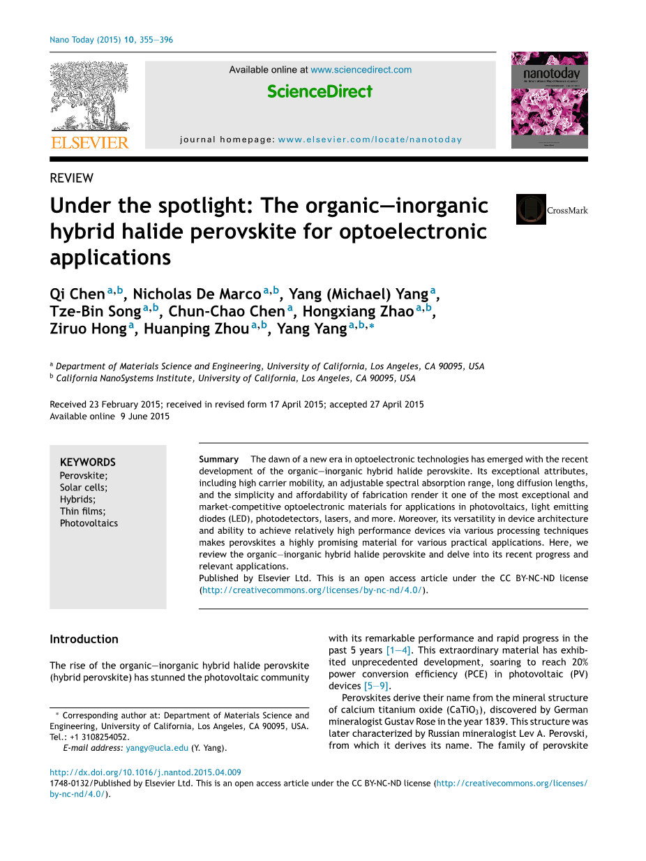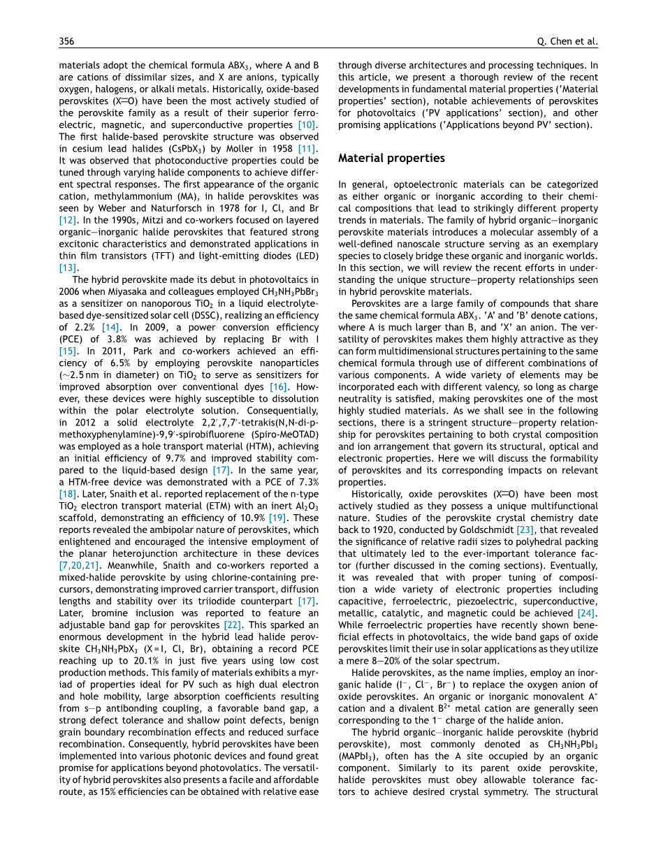 2006年,Miyasaka及其同事在液体电解质型染料敏化太阳能电池(DSSC)中首次采用CH3NH3PbBr3作为纳米多孔TiO2的敏化剂,这是杂化钙钛矿在光伏领域首次亮相,并且实现了2.2%的光电转化率。在2009年,有人通过用I代替Br,实现了3.8%的光电转化率。2011年,Park和同事通过在TiO2上使用钙钛矿纳米颗粒(直径约2.5 nm)作为敏化剂,提高了吸收率,使其比传统染料的效率提高了6.5%。然而,这些装置在极性电解质溶液中非常容易被溶解。 因此,在2012年,有人使用2,2#39;,7,7#39;-四(N,N-二对甲氧基苯胺)-9,9#39;-螺二芴(Spiro-MeOTAD)固体电解质用作空穴传输材料(HTM ),想必于基于液体的设计,其实现了9.7%的初始效率并且改善了其稳定性。同年,无HTM设备实现了7.3%光电转化率。 后来,据报道,Snaith等人用惰性Al2O3支架替换n型TiO2作为电子传输材料(ETM),实现了10.9%的光电转化率。这些报道揭示了钙钛矿的双极本质,它启发并鼓励了人们去探究这些器件中平面异质结构的深入使用。与此同时,Snaith及其同事报道了一种使用含氯前体的混合卤化物钙钛矿,并证明其载体运输,扩散长度和三碘化物相对稳定性均得到改善。后来,据报道,溴的包合物具有可调节的钙钛矿带隙的功能。这引发了混合铅卤化物钙钛矿CH3NH3PbX3(X = I,Cl,Br)的巨大发展,在使用低成本生产方法的情况下在短短五年内便获得了创纪录的20.1%的光电转化率。这一系列材料具有很多理想的光伏特性,如高双电子和空穴迁移率,由s-p反键耦合产生的大吸收系数,良好的带隙,强的缺陷容限和浅的点缺陷,良性的晶界重组效果和减少的表面重组。因此,混合钙钛矿已经应用到各种光子器件中,并且有很大希望应用在光伏以外的应用。混合钙钛矿的多功能性也提供了一个简便且经济实惠的制备太阳能电池的途径,因为我们通过不同的架构和处理技术可以相对容易地获得15%的效率。 在本文中,我们将对基础材料性能(#39;材料特性#39;部分),钙钛矿光伏应用(#39;光伏领域的应用#39;部分)和其他有前景的应用(#39;超越光伏领域的应用#39;)进行一个介绍。