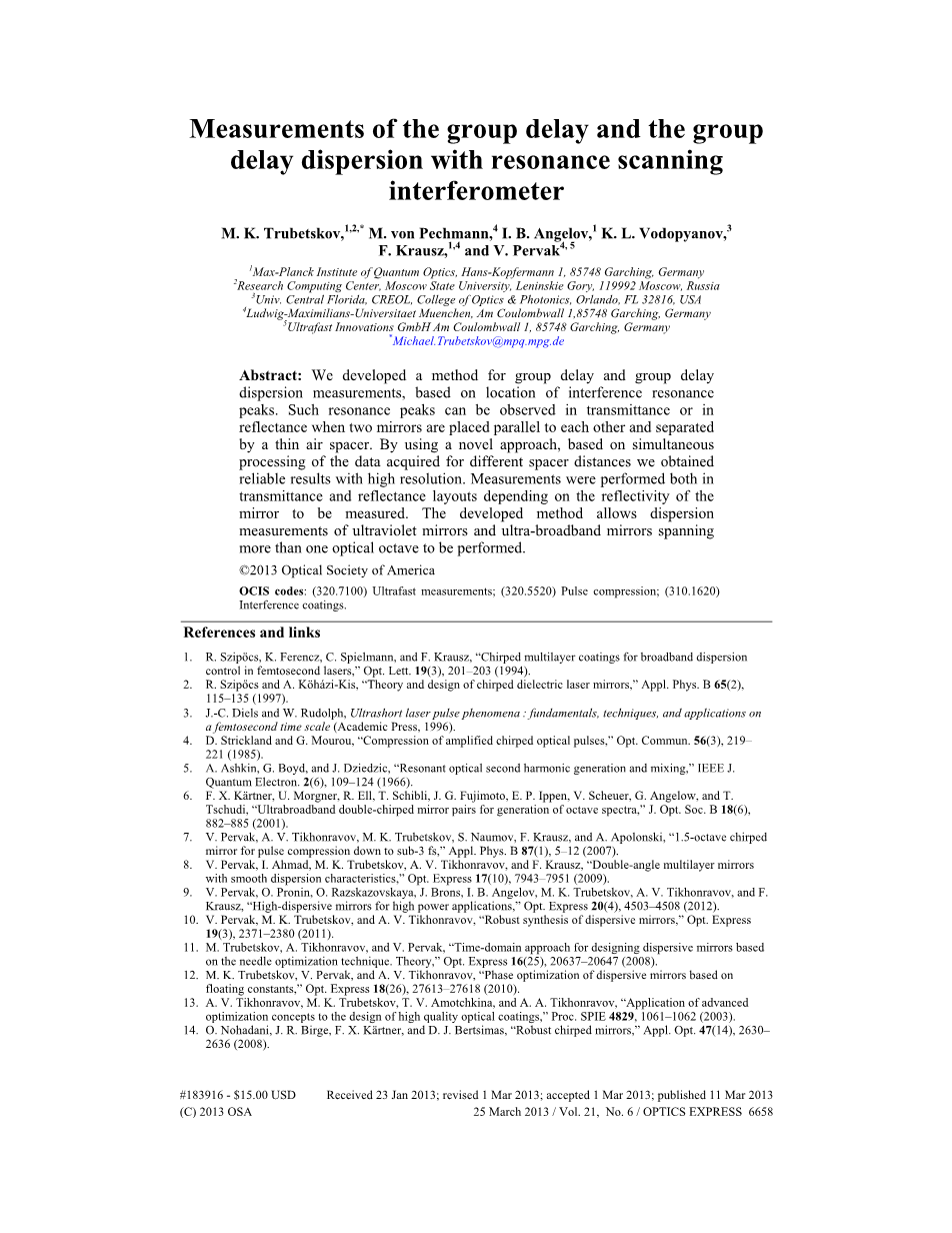 摘要:基于干扰共振峰的位置,我们开发了一种群延迟和群延迟离差测量的方法。 当两个反射镜彼此平行放置并由薄气垫隔开时,可以在透射率或反射率中观察到这种共振峰。 通过使用一种新颖的方法,基于对不同间隔距离采集的数据的同时处理,我们获得了高分辨率的可靠结果。 根据要测量的反射镜的反射率,在透射率和反射率布局中都进行测量。 所开发的方法允许执行横跨多个光学倍频程的紫外镜和超宽带镜的色散测量。
