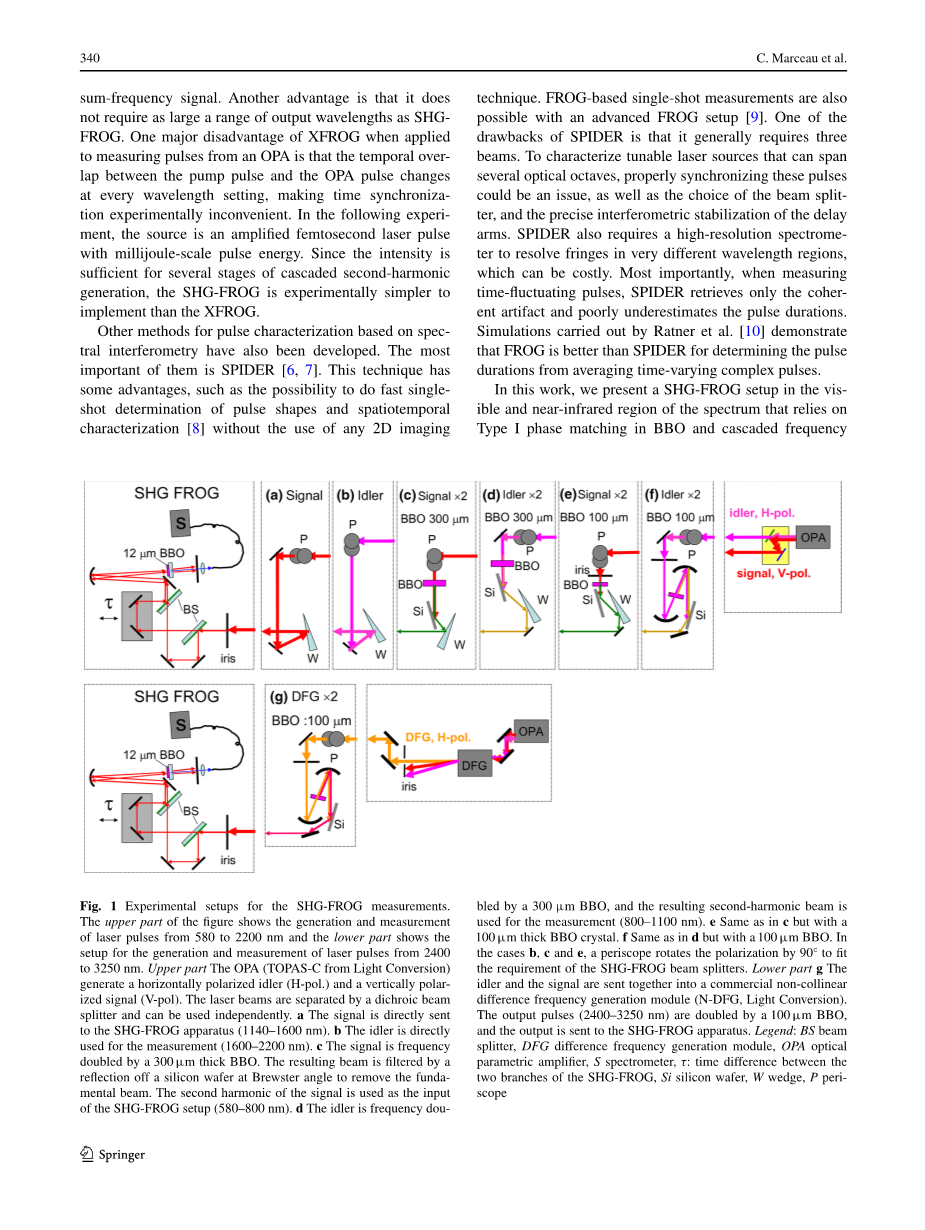 在本工作中,我们提出了一种SHG - FROG装置,它依赖于BBO中的I型相位匹配和级联频率上变频。采用钛宝石激光放大器( Femtopower PRO V . CEP,26fs,1 kHz )泵浦商业光学参量放大器( TOPAS - C,光转换)。我们报告了信号( 580–800 nm )和惰轮( 800–1100 nm )、基本信号( 1140–1600 nm )和惰轮波( 1600–2200 nm )的二次谐波的脉冲形状测量结果。我们还报告了信号和惰轮( N - DFG,光转换)之间从2400到3250 nm的差频信号的测量。在后一种情况下,执行另一倍频以将FROG测量保持在分光计的范围内。详细描述了在该附加频率转换之前检索脉冲形状的过程。阐述了相位匹配的作用以及对分束器滤波效果和色散的修正。还测量了各种晶体的倾斜角,并与BBO中I型SHG的相位匹配曲线进行了比较。我们证明了在2.5个光学八倍频程上的脉冲特性,主要受倍频晶体的透明范围和光谱两端缺乏强光源的限制。