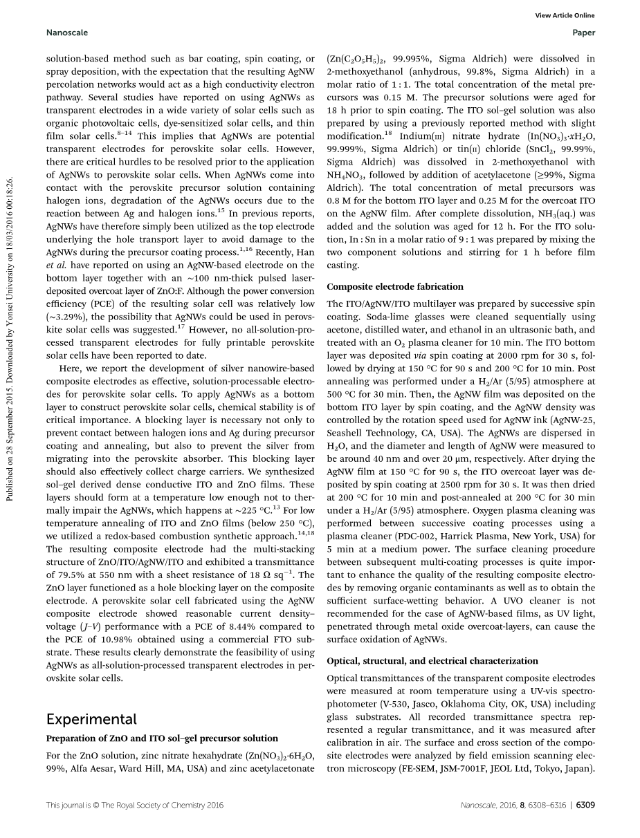 对于ZnO溶液,六水合硝酸锌(Zn(NO3)2·6H2O,99%,Alfa Aesar,Ward Hill,MA,USA)和乙酰丙酮锌(Zn(C 2 O 5 H 5)2,99.995%,Sigma Aldrich)溶解2-甲氧基乙醇(无水,99.8%,Sigma Aldrich)摩尔比为1:1。金属前体的总浓度为0.15M。前体溶液旋涂前老化18小时。 ITO溶胶 - 凝胶溶液也是通过使用先前报道的方法轻微的修改制备18硝酸铟(III)水合物(In(NO3)3·xH2O,99.999%,Sigma Aldrich)或氯化锡(II)(SnCl 2,99.99%Sigma Aldrich)与2-甲氧基乙醇一起溶解NH4NO3,然后加入乙酰丙酮(ge;99%,SigmaAldrich公司)。底部ITO层金属前体的总浓度是为0.8M,外涂ITO为0.25M在AgNW薄膜上。完全溶解后,加入NH3(水溶液)并将溶液老化12小时。对于ITO溶液,In:Sn以摩尔比9:1混合并在成膜前搅拌1小时。