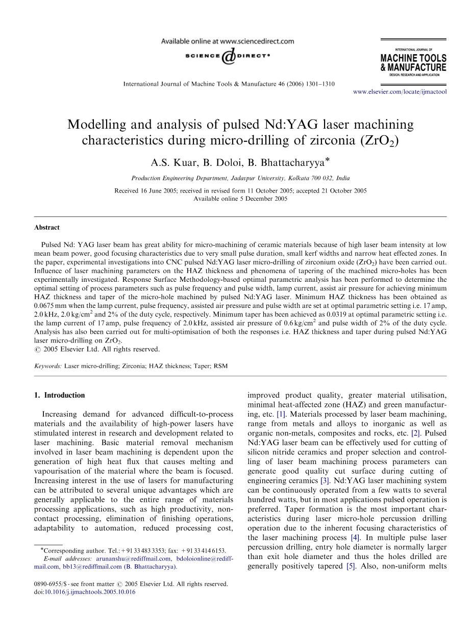 在氧化锆微钻过程中,脉冲Nd:YAG激光加工特性的建模与分析