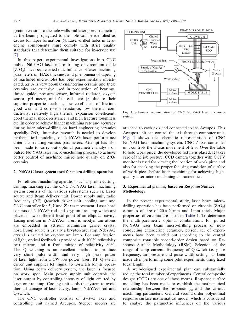 在目前的实验研究中,激光器光束微钻操作已经进行氧化锆陶瓷(氧化锆)大小20times;20毫米和1毫米厚。氧化锆的主要性能如表1所示。为确定脉冲Nd:YAG激光微孔加工非导电工程陶瓷的多参数最优组合,基于响应面方法学(RSM)的中心复合可旋转二阶设计,进行了实验研究。在使用固定焦距进行了一些先导实验后,选择了灯电流范围、q开关频率、脉冲频率、气压和脉宽设置。