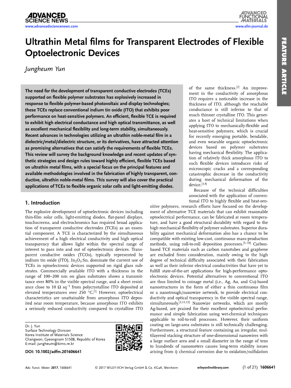 在热敏聚合物上的性能表现较差。一个高效的、柔性的TCE必须表现出高电导率和高光学透射率,同时具有优异的机械灵活性和长期稳定性。在电介质/金属/电介质结构或其衍生物中利用超薄贵金属膜的技术的最新进展作为可满足灵活TCE的要求的有前途的替代方案已引起关注。本次审查将调查基于超薄金属薄膜的高效灵活TCE的合成策略和设计规则的背景知识和最新更新,特别着重于制造高透明度, 超薄贵金属薄膜。本次调查还将涵盖TCEs在柔性有机太阳能电池和发光二极管方面的实际应用。