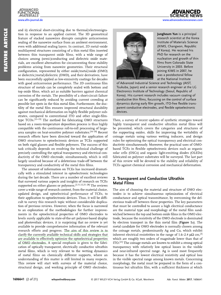 过去十年间,随着对光电子技术兴趣的激增,传统文化表现形式的信息量急剧增加。有许多优秀的评论调查了玻璃或聚合物支持的TCE研究的各个方面和见解。这些评论涵盖了广泛的研究内容,从材料选择,更新设计和TCE的光电性能,到其光电子器件应用。因此,如果没有前人大量的反复评价,调查这个研究课题是很困难的。然而,当重点缩小到探索OMO电极光电特性进一步改进的方法时,其水平肯定可应用于最先进的基于聚合物的显示器和光伏器件,令人惊讶的是,目前还没有审查可以提供有关研究工作和进展的全面信息。这次审查的目的是澄清目前可用的技术技能和战略,可用于有效优化OMO电极的光电特性。特别强调光学透明的导电超薄金属薄膜的制造,这与金属薄膜在化学上不同的支撑物上的润湿动力学非常相关,其中对这个问题的理解在很多方面仍然有限。本次审查将从对OMO电极的材料选择,结构设计和工作原理的调查开始。然后,将介绍最近更新高透明度和导电超薄金属薄膜合成策略的调查报告,其中包括支持氧化物的类别和结构,使用各种润湿诱导剂改善造币金属可湿性的技巧以及设计规则 同时优化光学透明度和电导率。此外,OMO基TCEs在柔性光电子器件(如有机太阳能电池(OSC)和有机发光二极管(OLED))制造于聚合物基板上的实际应用将进行调查。本综述的最后部分将致力于TCEs抗化学腐蚀和机械变形的稳定性和可靠性。