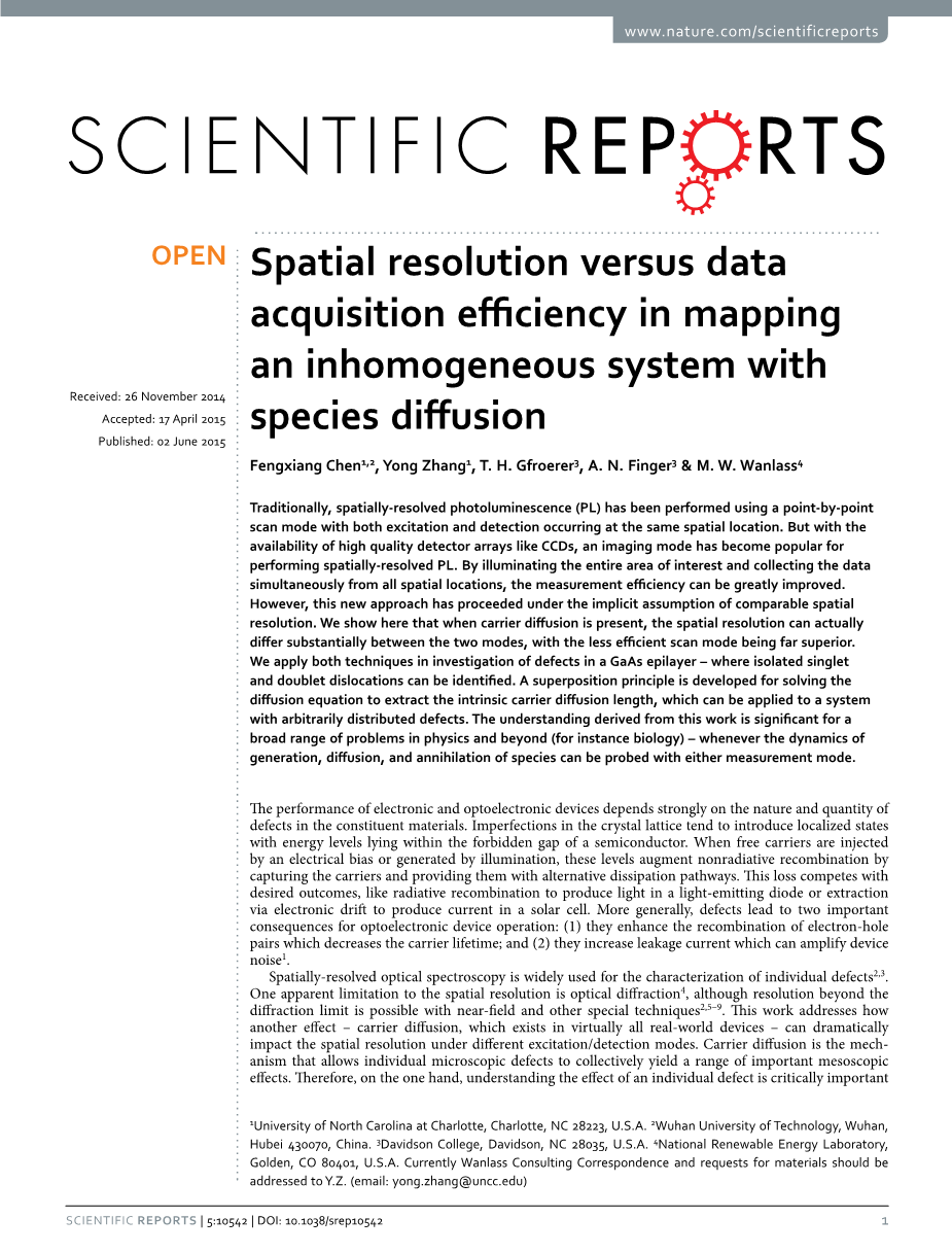 空间分辨光致发光光谱被广泛用于单个缺陷的特性研究,系统的空间分辨率由光学系统的衍射极限决定,而要得到克服衍射极限的分辨率也是可以实现的,需要使用近场成像或其他特殊的成像技术。这项研究解释了另一种广泛存在于器件中的效应--载流子扩散,是怎样在不同的激发/检测模式下影响系统的空间分辨率的问题。载流子扩散的机理为:多个微小缺陷聚集在一起产生一些重要的微观效应。因此,一方面,理解单个缺陷的影响对于解释粒子的微观行为至关重要;另一方面,单个缺陷还可以作为传感器用于探测一些微观现象,如载流子扩散,同时也能用来估算不存在缺陷时的本征扩散长度。
