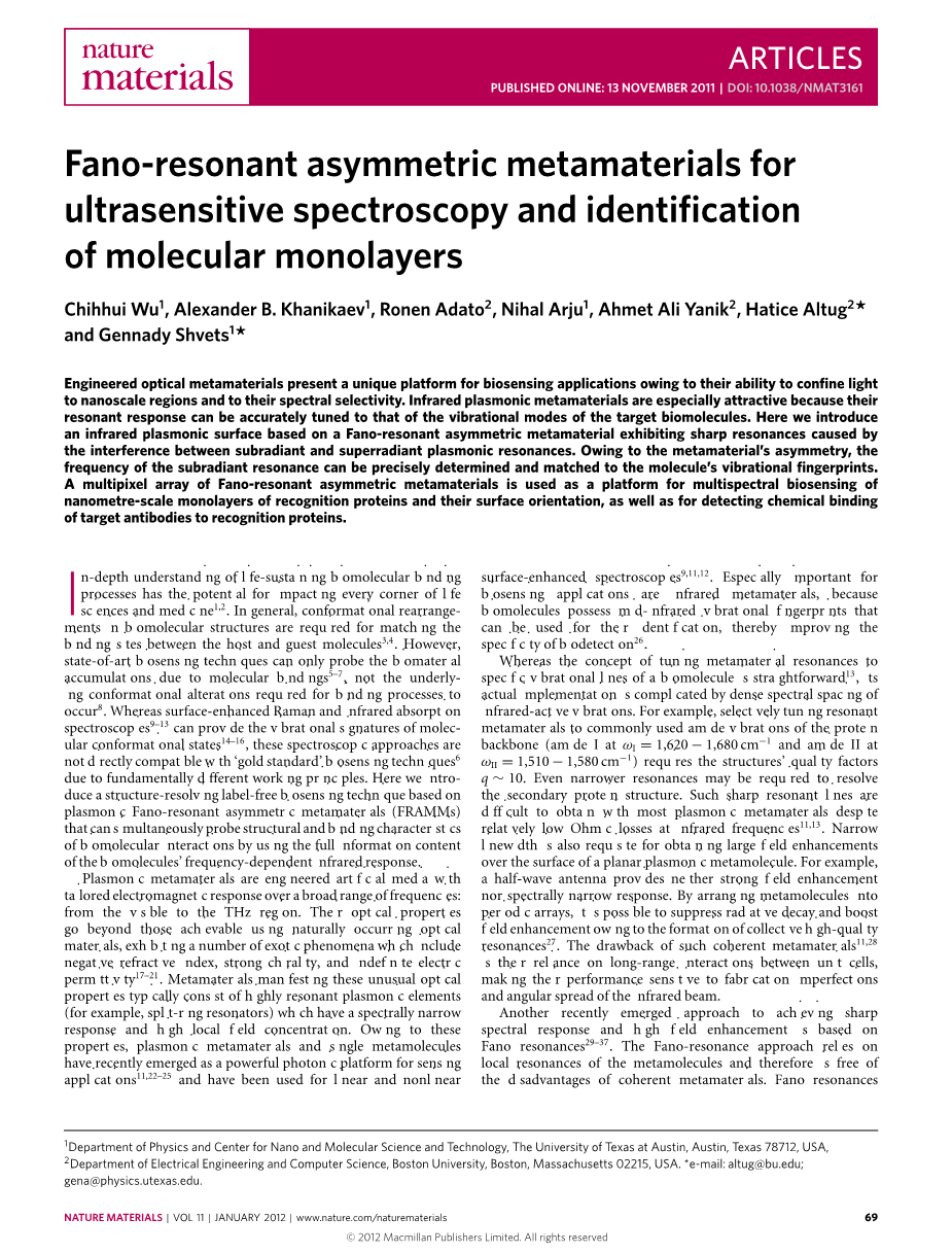 工程光学超材料为生物传感应用提供了一个独特的平台,因为它们拥有光谱选择能力并且能够将光限制在纳米量级。红外等离子体超材料特别有吸引力,因为它们的共振响应可以精确地调谐到目标生物分子的振动模式。我们在这里介绍了一种基于法诺共振的非对称超材料的红外等离子表面,并在此基础上产生了子波的干涉和超辐射等离子体共振,从而引起了尖锐的共振。由于超材料的不对称性,可以精确地确定并与分子的振动特性相匹配的子波共振频率。一种多像素的法诺共振非对称超材料阵列,被用作纳米级单分子识别蛋白及其表面方向的多光谱生物传感的平台,同时也用于检测目标抗体与识别蛋白的化学结合。