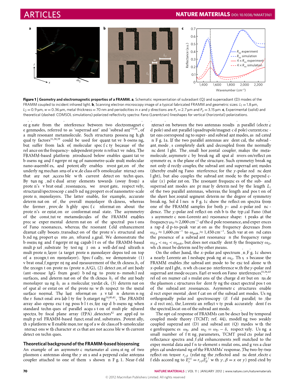 几个黄金FRAMMs是在石英上制作的底物,如图1b所示,具有反射率谱用傅里叶变换红外(FTIR)显微镜测量(见方法)。1亿5千万的帧数像素被设计成在不同频率上产生共振,均匀扩展他们的尺寸。测量反射率光谱从图1c中所示的典型像素中,用于确定Fano共振频率q来自的峰值,并且是精确地安装数字(COMSOL)和分析(TCMT)计算。具体结构的生物传感是由在框架的表面固定两种蛋白质纳米分子:(1)一种单一的识别蛋白质A/G厚度h1,和(2)一个多蛋白的厚度H=h1 h2单层的山羊抗体IgG,在上面的图3b中显示的蛋白质A/G。光传导对黄金的蛋白质结合是通过测量标准化的差分反射率每个帧的像素都是由它的标记的。